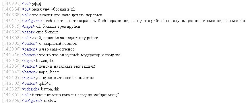[21:54:38] <Дед-Пихто> наконец в чате настало "светлое будущее" - ни одно модератора в чате