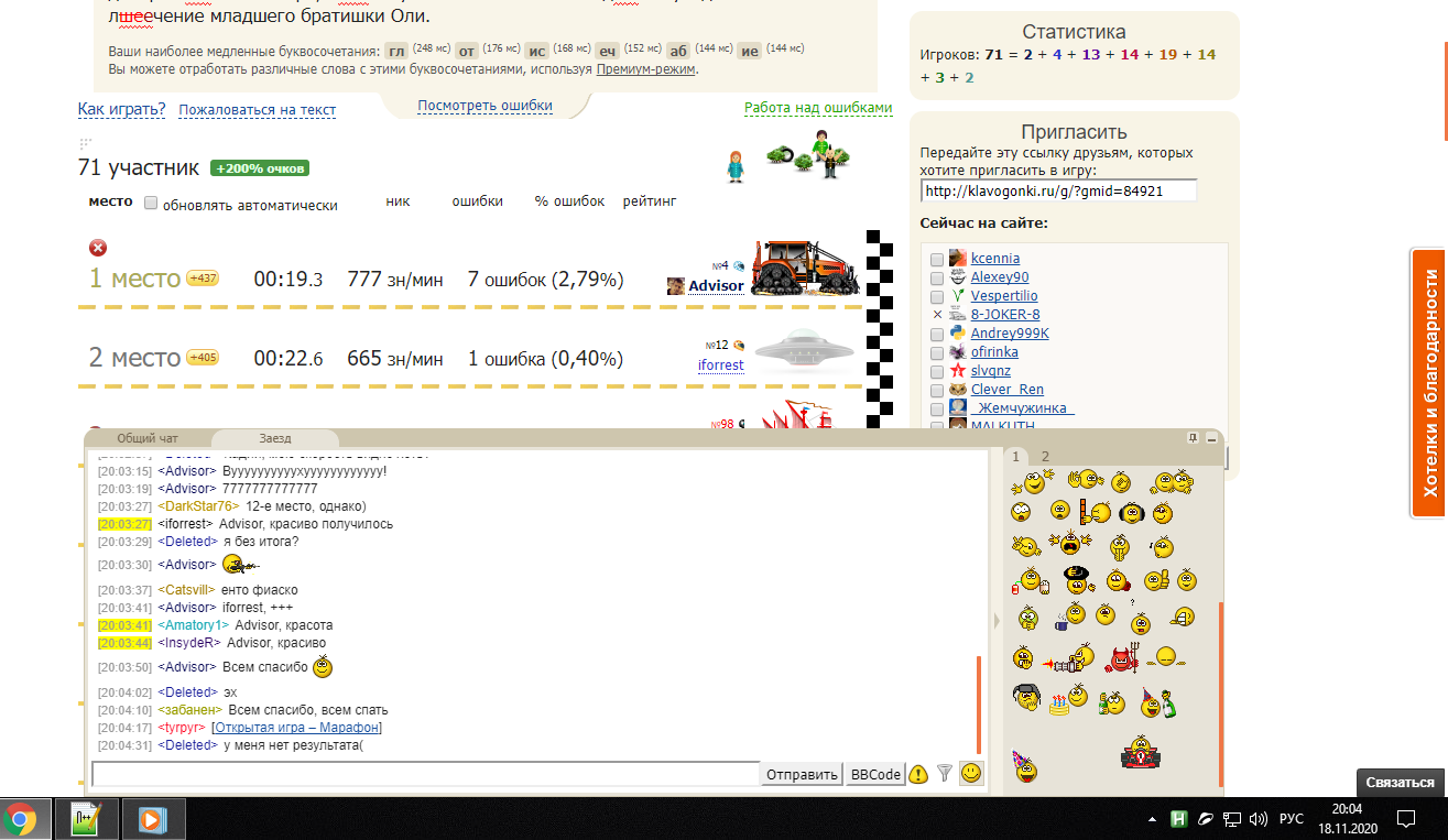 [00:05:35] <Advisor> Biba, http://klavogonki.ru/chatlogs/2020-11-17.html#23:19:15 — :wine: твоё здоровье, брат.
