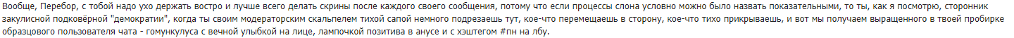 [20:35:20] <Galaad> cupofinsane, это он так вуалирует "мразь". Держу в курсе. BorisQuirt вообще очень любит негатив и желчь в чат изливать, я заметил. (:
