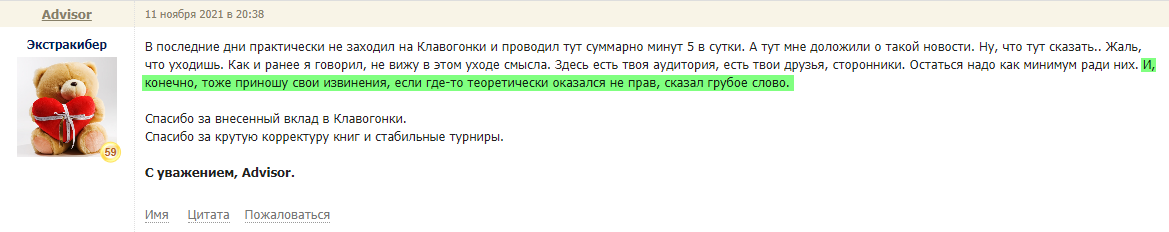 [20:38:08] <Advisor> То есть фактически переступил через себя, лишь закрыть конфликт, пойти навстречу так сказать. Конечно в этой фразе позитивного не было. Тут окей, но я и извинился поэтому на всякий случай (мол, если обидел, сори).