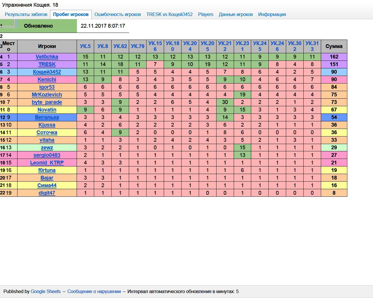 Выложил на добавленный в Google Spreadsheets лист "УК.ВСЕ" таблицу с отображением скоростей участников, выполнивших пробег хотя бы по трем частям (42/238 словарей) из семнадцати. Соответственно, где "0" по скорости, там и нулевой пробег. Позже планируется сделать данную таблицу более читабельной. Лидеры: скрытый текст… Кощей3452 8 0 Kenichi 6 0 Tazovod 6 0 igor53 5 0 Kjussa 5 0 Zephir 5 0 AlViNic 4 0 f0rtuna 4 0 tatava 4 16 karalina 5 20 natalishka 4 58 ГДВ 5 73 Nuria 4 84 romashka_raz 4 91 Валацуга 6 98 MrKozlevich 5 98 Последний раз отредактировано 24 ноября 2017 в 10:00 пользователем Кощей3452