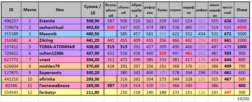 Зачет скорости по режимам от 150 зн/мин, в буквах - 130 , в цифрах от 100 зн/мин, если нет технических накладок, в цифрах жду от 80 зн/мин. Форма зачета средняя из 10 заездов, если пропущен какой-то заезд или имел место недоезд в одной из двух безошибок, то сумму скорости каждого делится все равно на 10 заездов, чтобы не было недоездов для букв и цифр, как наименее скоростных режимов и безошибочники имели бы дополнительный шанс. В зачет идет лучшая из безошибок. Бонусов не будет. Призовые картинки первой тройке выдаются при пробеге не менее 500 текстов, в случае сомнений результата без пробега - при наличии Тс. Картинка лучшего в ранге выше таксиста выдается при наличии 1000 текстов в любом режиме.. Предварительный график проведения на следующий месяц находится в главной темеправила на случай лагов во время создания иксов или других лагов:скрытый текст… 1. если более чем у трети участников нет результата, осуществляется переезд 2. если не засчитано менее чем у трети, предоставлять данные спидометра по средней скорости (для владельцев премиума) и количество ошибок в личку сразу после заезда до начала следующего, в отсутствие Тс в личку. В случае рекорда или результата близкого к нему - Тс обязательна при любом незачете результата. на случай странных рекордов:скрытый текст… В случае рекорда выше предыдущего более чем на 50 знаков, Тс-ка обязательна, иначе заезд убирается из зачета как глючный. В случае превышения абсолютного рекорда сайта в любом из режимов, наличие Тс обязательно. В противном случае игрок считается нечестным, использующим посторонние программки и убирается из зачета полностью. Дизайнер: Дед-ПихтоСпасибо спонсорам: Даниэль, AvtandiLine, Notyet, Виталька, -IL-, Серж_Благ, zonik, Supersonic, нерд, G-Light, sav1, HeLLios, oyasumi, agile, Numb_kz, Kenshin, Баунд, ТрупОдиночка, Alsim, Тарья, natalishka, Ирдэнс, Кот_Черныш, Telefunkenist, omnia, KOSTYA410, system_error, MacRushin_M, Tazovod, dogs_life, lovermann, Перфил, Рустамко, tarak, puchkarito, avaloni, Clara_Oswald, Oxanette, Last_Imperator, iji, Tatsi_3006, ofirinka, Anastasia_81, Advisor, sashavirtual, анонимный спонсорРезультаты прошлых соревнований: скрытый текст… РУ № 1 (04.03.13), РУ № 2 (11.03.13), РУ № 3 (18.03.13), РУ № 4 (25.03.13), РУ № 5 (01.04.13), РУ № 6 (08.04.13), РУ № 7 (15.04.13), РУ № 8 (22.04.13), РУ № 9 (06.05.13), РУ № 10 (13.05.13), РУ № 11 (20.05.13), РУ № 12 (27.05.13), РУ № 13 (03.06.13), РУ № 14 (10.06.13), РУ № 15 (17.06.13), РУ № 16 (24.06.13), РУ № 17 (01.07.13), РУ № 18, РУ № 19 (15.07.13), РУ № 20 (22.07.13), РУ № 21 (29.07.13), РУ № 22 (05.08.13), РУ № 23 (12.08.13), РУ № 24 (19.08.13), РУ № 25 (02.08.13), РУ № 26 (02.09.13), РУ № 27 (09.09.13), РУ № 28 (16.09.13), РУ № 29 (23.09.13), РУ № 30 (30.09.13), РУ № 31 (14.10.13), РУ № 32 (28.10.13), РУ № 33 (28.10.13), РУ № 34 (04.11.13), РУ № 35 (11.11.19), РУ № 36 (18.11.13), РУ № 37 (25.11.13), РУ № 38 (02.12.13), РУ № 39 (09.12.13), РУ № 40 (16.12.13), РУ № 41 (30.12.13), РУ № 43 (13.01.14), РУ № 43 (20.01.14), РУ № 44 (27.01.14), РУ № 45 (03.02.14). РУ № 46 (10.02.14), РУ № 47 (24.02.14), РУ № 48 (27.02.14), РУ № 49 (03.03.14), РУ № 50 10.03.14 (юбилейный), РУ № 51 17.03.14, РУ № 52 (31.03.14), (10.04.14 19:05) РУ № 53, РУ № 54 (14.04.14), РУ № 55 (21.04.14), РУ № 56 (28.04.14), РУ № 57 (08.05.14), РУ № 58, РУ № 59 (19.05.14), РУ № 60 (26.05.14), РУ № 61 (09.06.14), РУ № 62 (16.06.14), РУ № 63 (23.06.14), РУ № 64 (07.07.14), РУ № 65 (14.07.14), РУ № 66 (21.07.14), РУ № 67 (28.07.14), РУ № 68 (11.08.14), РУ № 69 (18.08.14), РУ № 70 (25.08.14), РУ № 71 (01.09.14), РУ ;№ 72 (08.09.14), РУ № 73 (15.09.14), РУ № 74 (29.09.14), РУ № 75 (06.10.14), РУ № 76 (13.10.14), РУ № 77 (27.10.14), РУ № 78 (03.11.14), РУ № 79 (10.11.14), РУ № 80 (17.11.14), РУ № 81 (24.11.14), РУ № 82 (01.12.14), РУ № 83 (08.12.14), РУ № 84 (22.12.14), РУ № 85 (29.12.14), РУ № 86 (05.01.15), РУ № 87 (19.01.15), РУ № 88 (02.02.15), РУ № 89 (16.02.15), РУ № 90 (23.02.15), РУ № 91 (02.03.15), РУ № 92 (16.03.15), РУ № 93 (23.03.15), РУ № 94 (30.03.15), РУ № 95 (20.04.15), РУ № 96 (27.04.15), РУ № 97 (18.05.15), РУ № 98 (25.05.15), РУ № 9