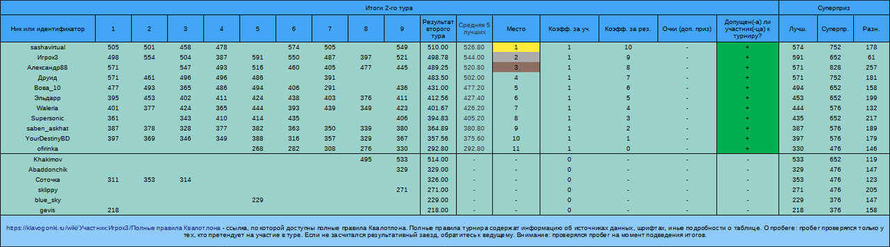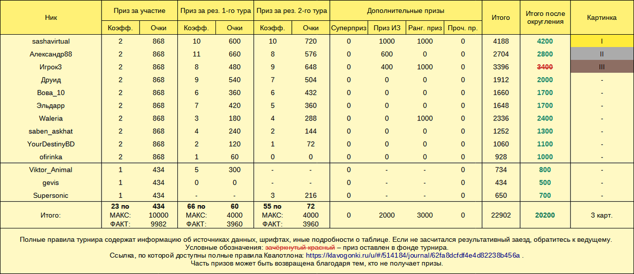 Добро пожаловать в невероятный мир турнира «Квалотлон»! Квалотлон — это турнир, это суббота ( 3 февраля), это 20:35, это 15 заездов, это Квалификация и не только она.  Как поучаствовать в турнире? Выполнить 5 обязательных требований к участнику Квалотлона: 1) зайти в заезды, которые создаёт Квалотлон (можно добавить в друзья для удобства). Искать заезды нужно в 20-35 3 февраля 2024 года; 2) пройти в первом туре 3 «обычных» заезда (из 6 создаваемых ведущим); 3) успешно пройти во втором туре 5 «квалификационных» заездов (из 9 создаваемых ведущим, текст — тоже «обычный», но картинка); 4) иметь рекорд в «обычных» заездах, который не меньше 300 (до турнира); 5) иметь пробег в «обычных» заездах, который не меньше 500 (на момент подсчёта); Турнир проходит автоматически? Сейчас — да. Если турнир проходит автоматически, к участникам выдвигается ещё одно требование. Необходимо успевать допечатать текст достаточно быстро. В первом туре — за 1,5 минуты. Во втором туре — за 110 секунд общего времени ( включает в себя все паузы). Какие ещё требования к участнику Квалотлона есть? Что может делать ведущий турнира? Честная игра (в том числе ранговая) и соблюдение правил общения и сайта, само собой, тоже обязательны — настолько обязательны, что выше прописывать это требование ведущий даже не стал. Трактовка правил и спорных случаев, добавление, удаление и изменение правил и результатов, в том числе постфактум, остаются за ведущим. Ведущий может не выдавать призы и не заниматься организаторскими действиями, не объясняя причин. Ведущий может запрещать пользователям участвовать (получать призы и попадать в таблицы) — вплоть до полного запрета на участие во всех турнирах Квалотлона. Как определяется победитель? В туре — по средней скорости. В турнире — по сумме мест за 1-й и 2-й туры (меньше — лучше). Какие награды за участие есть? За участие хотя бы в одном туре (при обязательном выполнении требований к участнику Квалотлона под номерами 1, 4 и 5) — приз очками (но лучше поучаствовать в обоих, чтобы очков было больше). За попадание в тройку сильнейших по итогам двух туров (все требования в силе) — картинка от Квалотлона в бортовой журнал и дополнительные очки. Дополнительные призы — ранговый приз и суперприз. Призовой фонд турнира без учёта суперприза — ок. 18-27 тысяч очков. Суперприз... Что это? скрытый текст… Суперприз — это приз за один заезд второго тура (то есть за заезд Квалификации), пройденный очень быстро. Действует только во втором туре. В Квалотлоне №107 размер суперприза — 20 000 очков. С каждым турниром (со стандартным номером) требуемая для получения суперприза скорость чуть-чуть снижается (до момента выигрыша, после которого все начинается сначала). Суперприз выдаётся только участникам, которые соответствуют доп. требованиям к рангу и честности результатов. Ознакомьтесь с информацией о суперпризе: 1. Таблица требований к скорости для получения этого приза. 2. Формула, по которой определяется требуемая скорость, а также другие правила. 3. Что такое Суперподтверждение? - оно тоже необходимо для выдачи этого приза (ссылка ведёт на полные правила, не вся информация по ссылке связана с Суперподтверждением). Скорость, которая нужна во втором туре Квалотлона №107 (достаточно одного заезда при соблюдении других требований): Если ваш рекорд (далее в этом разделе речь во всех случаях про Об
