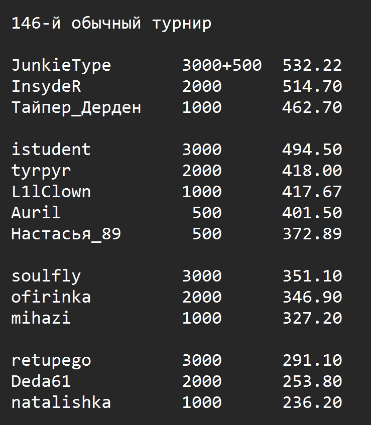 JunkieType писал(а): Да! подтверждаю, но это именно в "Лирике" и только в ней. https://skrinshoter.ru/saQYYJdGxjl Не только в этом словаре, а очень похоже, что в любом тексте/книге/словаре, где есть переводы строк. Например - https://klavogonki.ru/vocs/11938/ Старый баг, любой символ перевода строки засчитывается за два, хотя по факту печатаем только один пробел. Отсюда разница в количестве символов в тексте и, соответственно, в скорости. Но это нужно аккуратно поправить, пока я проверил только Лирику и Библию (тип - книга). Возможно, где-то правильно считает длину текста, зачитывая перевод строки за два символа (хотя сомневаюсь). Поэтому вопрос - а где вообще могут эти переводы строк встречаться? В обычках или каких-то других режимах где-то есть? Или только в словарях/книгах? Последний раз отредактировано 10 марта 2026 в 19:51 пользователем Skolopednra