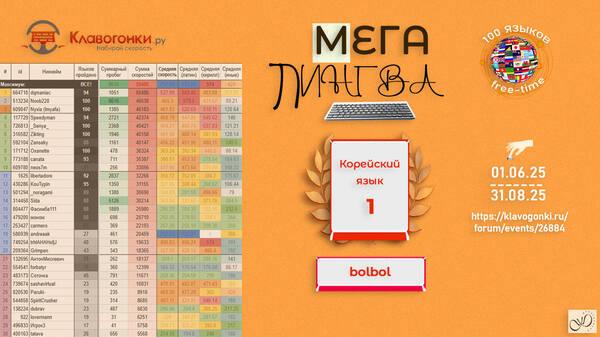 Два были объявлены заранее и два - сюрпризы. ) Топ-1 по безошибочности в первой сотне заездов - libertadore ![]() Топ-1 на русском языке и глобально в кириллице - Speedyman ![]() Топ-1 на родном языке - andreaak ![]() Топ-1 на корейском языке - bolbol ![]() Последний раз отредактировано 15 января 2026 в 23:01 пользователем Avtan75