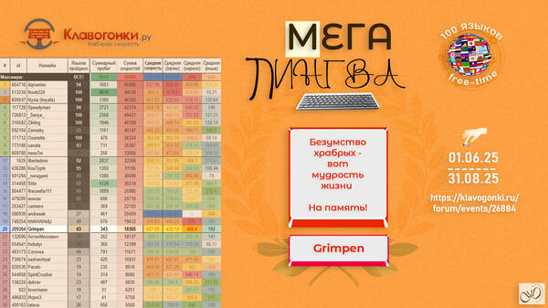![]() Гран-При 2026 В месяц проводится четыре тура. По туру каждую неделю. В зачет идут три лучших зачетных тура по очкам. Очки, полученные в каждом, суммируются в конце месяца в общей таблице. Тогда и определяется победитель. Правила 1. Время проведения: Четверг, 21:05 2. Участвуют клавогонщики следующих рангов: Таксист, Профи, Гонщик, Маньяк, Супермен, Кибергонщик, Экстракибер. 3. Система подсчета очков в заезде по формуле: ОЧКИ=СКОРОСТЬ - 6*КОЛИЧЕСТВО ОШИБОК. При равенстве очков побеждает тот, у кого средний процент ошибок меньше. 4. Количество заездов - 16. 8 в режиме Обычный + 8 по словарю Мультифингерс. В зачет идет 7 заездов в режиме Обычный + 7 заездов в словаре Мультифингерс (без худшего результата). Если у игрока по каждому режиму в туре в итоге есть 7 заездов, то ведущий вправе не принимать недостающие результаты, которые по какой-либо причине не сохранены. 5. Таймаут первого заезда - 2 минуты. Всех остальных - 1 минута или 45 секунд. Ограничение по скорости - минимум 140 зн/мин. 6. Для зачета тура необходимо минимум 6 заездов в каждом режиме. Для зачета месяца необходимо три зачетных тура. В таблицу тура попадают проехавшие в сумме 5 заездов. В таблицу месяца попадают проехавшие в сумме два тура. 7. Для зачета тура необходим минимальный пробег в Обычном режиме: таксистам - 500, профи - 700, гонщикам - 1000, маньякам - 1200, суперменам и выше - 1500 текстов. 8. У игроков, показывающих, по мнению ведущего, сомнительные результаты или участвующих в первые разы и показывающих относительно высокие результаты, ведущий может потребовать запись TS, в случае отказа игрок убирается из зачета. 9. Награждаются по итогам месяца призами-картинками и очками: 1 место, 2 место, 3 место в общем зачете; Лучший Кибергонщик; Лучший Супермен; Маньяки, занявшие 1, 2, 3 места в своем ранге; Гонщики, занявшие 1, 2, 3 места в своем ранге; Лучший Профи; Лучший Таксист. Поощрительными очками - все остальные, попавшие в зачёт. 10. По итогам тура награждаются очками: 1 место, 2 место, 3 место в общем зачете; Лучший Кибергонщик; Лучший Супермен; Лучший Маньяк; Лучший Гонщик; Лучший Профи; Лучший Таксист. Примечание: В случае, если участник выигрывает в двух категориях, то призы он получает за наибольшую. Т.е. если маньяк занял "1 место среди маньяков" и "3 место", то премируется только "3 место". Для награждения участников ранговыми наградами по итогам тура требуется, чтобы их не обогнали участники рангами ниже. 11. Для получения приглашения добавляйте Гран-При в друзья. 12. Предложения и пожелания направлять в главную тему соревнования Внимание! Турнир нуждается в спонсорах. Желающим помочь - перечислять очки пользователю Гран-При. Наши спонсоры: турандот, valula, natalishka, ТОМА-АТОМНАЯ, Тарья, Азиат, ToNick, Avalanche, citello, Корн, HRUST, Кинолог, эндиго, совет-солдат, tmpd, Supersonic, Йо-мобиль, Серж_Благ, Владимир2о18, sav1, iOlga, Aletca, _Sorriso_, Виталька, Korner, Alixan-Dag, Speedyman, AngelOfDream, Jane_Dark, _Влада_, еаеа, Moon_beauty, FarWin, libertadore, agile, ПВО, denisov7, SlavikusVOG, leshiy239, ural_17, Кот_Черныш, Nightcrawler, genie_1855, velocipede, карп, clair, fishca, _Сайман_, АнтонМискевич , Disobey, KOSTYA410, sergio0483, Clara_Oswald, Eremite, Сергей-, Dobby_, Glage, puchkarito, Anastasia_81, ofirinka, L44, vnest, Phemmer, avaloni, виток, __Anastasia__, Большой_Дрю, vIRwO, Milker, forbatyr, Zikting, Auril, lovermann, merely, _Senya_, system_error, JunkieType, SevoST, анонимные спонсоры |