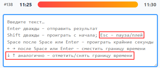 * когда автоматическая разбивка попала как надо - между слов, то стрелочкой вниз можно отметить время зелёненьким (чистовое); * стрелочки влево/вправо также подразумевают установку точного (зелёненького) времени; * если что-то не заладилось с чистовиком, то стрелочкой вверх можно сбросить на черновик. Ещё добавлена клавиша Esc для остановки/продолжения воспроизведения. |