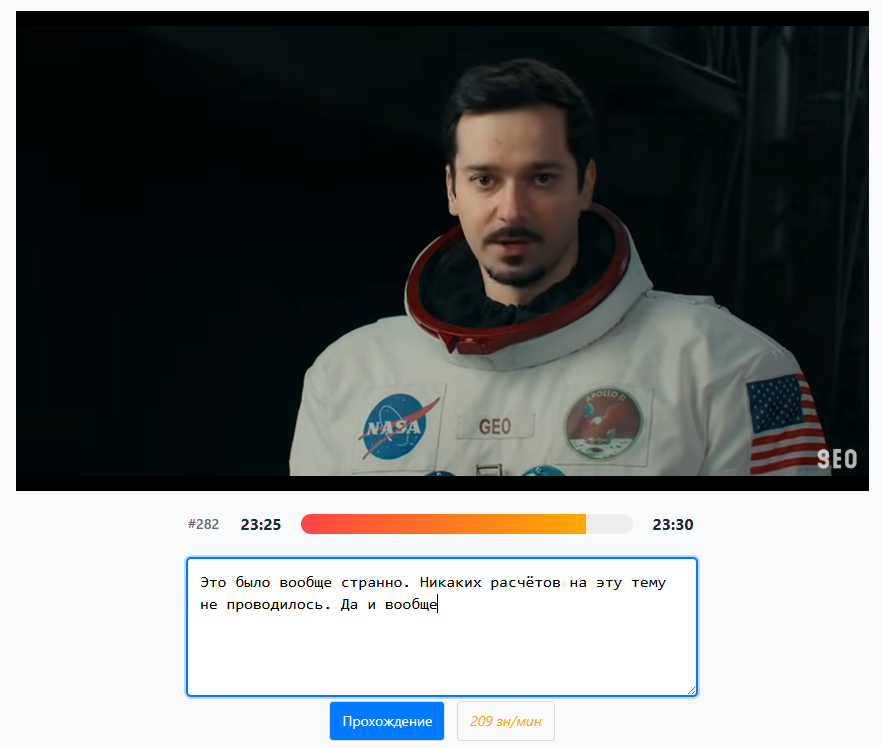 Потогонки: расшифровка №3 ![]() Для участия: Надо получить токен (если ещё нет) для входа в симулятор и в течение конкурсного времени расшифровывать видео отрывками по 5 секунд. скрытый текст… Для зачёта: За набор 1 содержательного* отрывка даётся 1 капелька; при повторном наборе - на 25% меньше предыдущего. За создание или исправление отрывка - 2 капельки; при копипасте - 0,5. Количество получаемых капелек также зависит от (не)наличия пунктуации/прописных (± 0,5). * Содержательность - 5+ слов или частей слов из 3-(кратно 5)-7 символов. Призы за скорость: Начиная с 8 фев. 11:00 нужно первым собрать 500 капелек, что даёт 1 гроуин*, а капельки списываются. Следующий гроуин даётся при достижении 625 капелек (+25%) и т.д. Можно получить несколько призов-гроуинов. * Гроуин (growwin) - монетка, которую можно: - обменять на очки (250k), Премиум (6 мес.) или сертификат wb/ozon (500 руб.); - использовать для увеличения фонда в текущем или следующем конкурсе (22 фев.). Призы за пробег: С 9 по 13 фев. проходят ежедневные голландские аукционы, где можно выиграть гроуин, сделав на него ставку в капельках: скрытый текст… Если в первые 5 минут часа было несколько заявок, победитель определяется формулой: (дата + сумма kg_id кандидатов) mod кол-во кандидатов = № победителя по возрастанию kg_id Также по этому правилу при завершении конкурса будет разыгран бонусный гроуин за 212 капелек (или 85+127).Призовой фонд: 11 гроуинов (5 за скорость + 5 за пробег + 1 бонусом). Организатор: Обсуждение концепции - в теме Симулятор расшифровщика. Предыдущие конкурсы: Расшифровка №1, Расшифровка №2. ---- Правила транскрибирования (будут пополняться по мере надобности) ----- 1. В эталоне (Создание) надо соблюдать пунктуацию, регистр и желательно ёфикацию. 2. Если фраза обрывается на полуслове, сместить границу времени. 3. Следующий говорящий - с новой строки. 4. Ставить тире перед строкой диалога НЕ нужно. 5. Если отрывок не содержит слов, поставить дефис. Последний раз отредактировано 10 февраля 2026 в 22:57 пользователем Потогонки