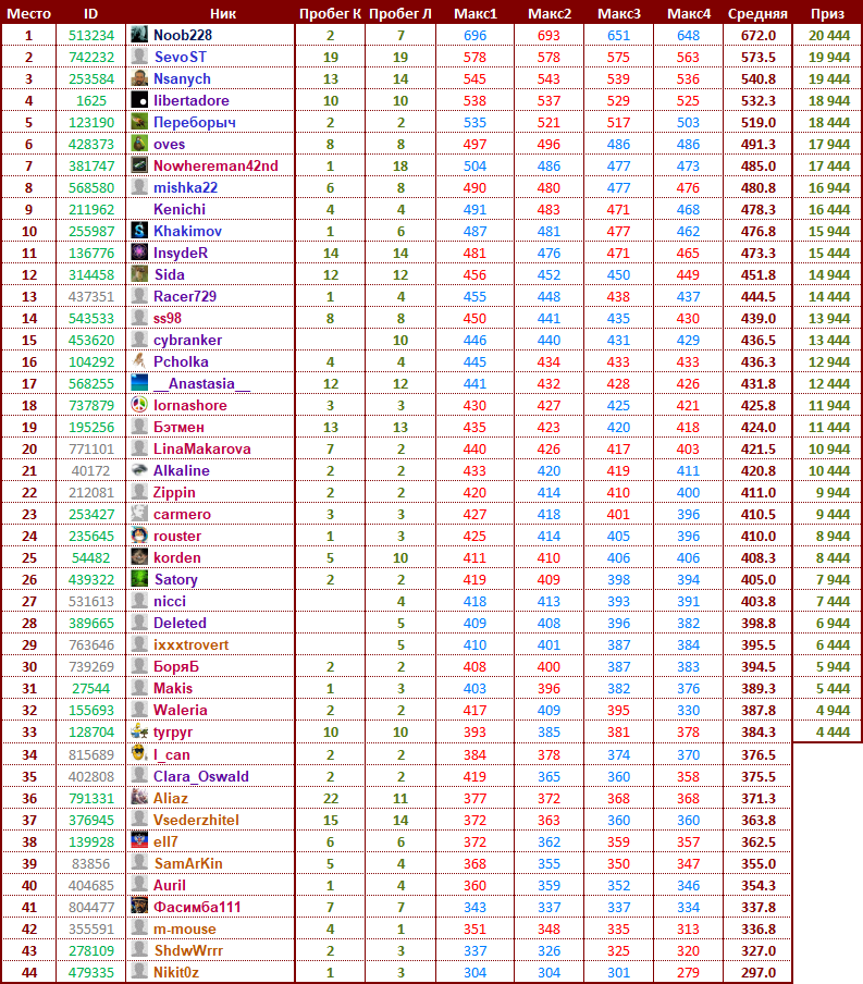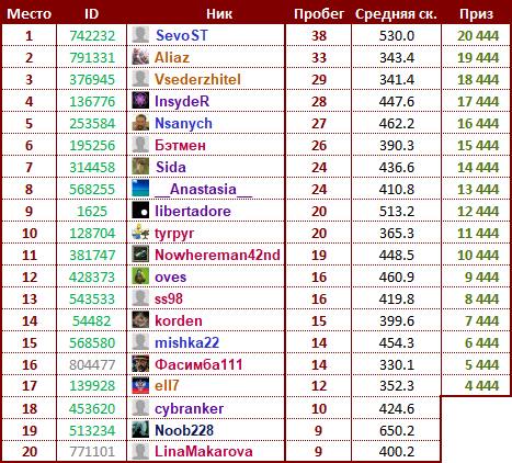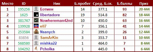 Биатлон - игровой турнир, в котором нужно показать максимальную скорость в марафоне, а также проехать как можно больше заездов в безошибочном режиме. Регламент: Турнир проводится по вторникам в 21:05, но возможны изменения, поэтому следите за темой на форуме. Участвовать могут все клавогонщики, с рангом от таксиста до экстракибера. Для попадания в зачёт требуется проехать минимум 2 марафона, со скоростью выше 50% от рекорда. Минимальные требования: 2000 текстов общего пробега и 500 текстов в обычном. Турнир состоит из 13 заездов: Марафон - 1 заезд (тайм-аут 2 мин); Безошибочный - 5 заездов (тайм-аут 1 мин); Марафон - 1 заезд (тайм-аут 2 мин); Безошибочный - 5 заездов (тайм-аут 1 мин); Марафон - 1 заезд (тайм-аут 2 мин); Подсчёт итогов: Для попадания в общий зачёт требуется проехать не менее двух марафонов, однако, для получения более высоких мест, нужны все три заезда, поскольку скорости в марафонах складываются и делятся на 3. Далее средняя скорость в марафонах округляется до ближайшего целого числа. Таким образом каждому участнику начисляется определённое количество баллов. Потом к этому числу мы прибавляем баллы заработанные, за каждый доезд в безошибочном режиме. Так как на более высоких скоростях, возрастает риск сделать ошибку, то за каждый доезд со скоростью: 150 и менее зн/мин - 27 баллов; 151 - 225 зн/мин - 29 баллов; 226 - 300 зн/мин - 31 баллов; 301 - 375 зн/мин - 33 балла; 376 - 450 зн/мин - 35 балла; 451 - 525 зн/мин - 37 баллов; 526 - 600 зн/мин - 39 баллов; 601 и более зн/мин - 41 баллов; Победителем, становится участник, заработавший максимальное количество баллов. При равенстве баллов, подсчёт ведётся по средней скорости в марафоне, а после и в безошибочном режиме. Пример: скрытый текст… Участник проехал 3 марафона со средней скоростью в 420 зн/мин, а также 5 безошибок, со скоростью: 460, 454, 440, 425 и 415. Так как средняя скорость в марафоне 420 зн/мин, то участнику начисляется 420 баллов. Далее за проезд в безошибке со скоростью: 460 и 454 участник получает по 36 баллов, а за доезды со скоростью: 440, 425, 415 получает по 34 балла. Таким образом: 420+36+36+34+34+34=594 балла. Награждения: Призы получают все участники попавшие в общий зачёт и имеющие необходимый пробег. 1 место получает 3000 очков и картинку в профиль; 2 место получает 2000 очков и картинку в профиль; 3 место получает 1500 очков и картинку в профиль; 4 место получает 1200 очков; 5-10 место получает от 1000 до 500 очков; 11-15 место получает 400 очков; 16-20 место получает 300 очков; 21-25 место получает 200 очков; 26-∞ получают по 100 очков; Лучшие, в своём ранге получают 1000 очков и картинку в профиль; Тройка лидеров в таблице по скорости получает от 500 до 100 очков; Тройка лидеров в таблице по точности получает от 500 до 100 очков; За каждый личный рекорд в марафоне участники получают 1000 очков; За каждый личный рекорд в безошибочном участники получают 1000 очков; За личный рекорд Биатлона участники получают картинку в профиль; За каждый доезд в безошибочном режиме участники получают по 25 или 50 очков, в зависимости от количества ошибок. За Полный комплект заездов (3+10), участники получают 500 очков; За 1-3 место в каждом ранге, в зачете по марафонам получают от 500 до 100 очков: За серию участий в 2 и более турнирах подряд, участники получают от 100 до 500 очков: За совпадение последних 3 цифр: номера темы и количество баллов в турнире участники получают от 100 до 1000 очков. Бонус: 500 очков тем местам, которые заканчиваются на 7. Ус