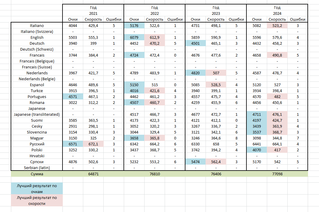 Сегодня я прошёл словацкий и тем самым завершил выступление в этом году. 368 3687 3 0.081 3537 SK TAKI KB В этом году я поставил рекорд по суммарному количеству набранных очков - 77098! Обогнал предыдущий лучший результат 2022-го года на 288 очков. А в табличке под хайдом вы можете посмотреть статистику всех моих выступлений. В этом году скорость набора у меня получилась выше, чем обычно (в 8 языках я поставил рекорд по скорости), но ошибок допускал довольно много (из-за этого рекорд по набранным очкам поставлен только в 5 языках, и в остальных языках число набранных очков из-за ошибок сильно снизилось). Последний раз отредактировано 20 апреля 2024 в 16:42 пользователем 170000
