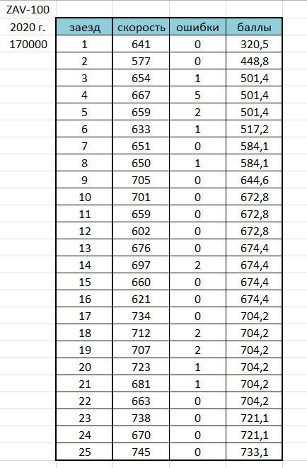 Табличку свою посчитала. По 8 заездам (треть с хвостиком!) результаты пришлось узнавать из экранного видео: когда набирала, проскакивала. )) iforrest писал(а): Если честно, результатом недоволен. ... На тренировках удавалось набирать 700 баллов несколько раз. Но то тренировки, а тут сразу какой-то мандраж, пальцы по клавишам не попадают. В итоге -- ни скорости, ни точности нормальной. Особенно в конце, когда нужно было рисковать, чтобы хоть как-то улучшить. Конечно, мандраж. Но Вы справились! Я там где-то ближе к концу рисканула тоже. И ошибка! А скорость получилась. )))