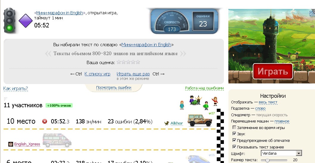 5 заездов в словаре "Мини-марафон in English", минимальная скорость - 200 зн/мин, минимальное количество доездов до попадания в зачет - три.
