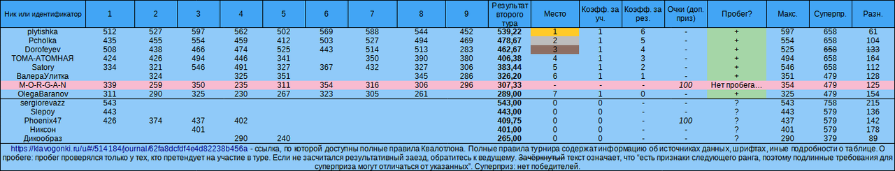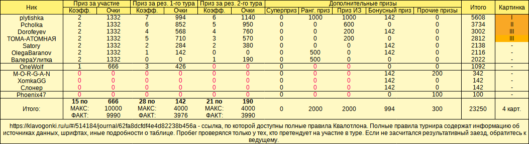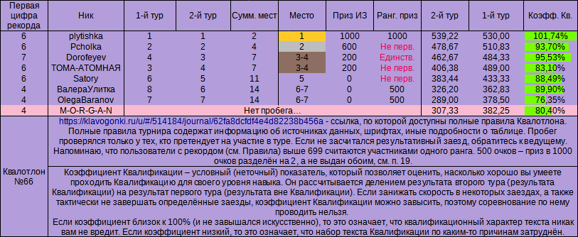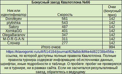 Здравствуйте! В субботу (29 октября), в 18-05 состоится Квалотлон №66 - гонки в Квалификации и вне неё! Неактуальное: планируете участвовать или хотите поучаствовать, но сомневаетесь, что получится? Пройдите экспресс-опрос (завершён) из одного вопроса, чтобы ведущий знал, что вы хотите участвовать! Проходить опрос для участия необязательно. Опрос ни на что не влияет, его единственная цель - прогнозирование количества участников. Кратко: 1) Квалотлон, 18-05, суббота (29.10.2022); 2) 15 заездов, сначала – 6 Обычных вне Квалификации (1-й тур), затем – 9 Обычных в Квалификации (2-й тур). 3) рекорд (Обычный) - 300+, пробег (Обычный) – 500+, 50% заездов тура позволяют попасть в зачёт тура, 2 тура - для итогового зачёта; 4) зачёт: скорость (по турам), итоговый зачёт; возможные призы: очки; 5) читерам – нет, нестандартным методам – нет. АЗ, незавершённым текстам – да. А. Проводятся 15 заездов. Заезды №№1-6 (1-й тур) проводятся в Обычном (вне Квалификации). Остальные заезды (9 заездов 2-го тура) также проводятся в Обычном (на этот раз - в Квалификации). Б1. К участию допускаются только пользователи, имеющие рекорд не ниже “300” и пробег не менее 500 текстов (в обоих случаях речь про Обычный). Б2. Чтобы стать участником тура, необходимо также показать результат (определённую скорость) в 3 или 5 заездах тура (в 1-м/2-м туре соответственно). Б3. Чтобы стать участником всего турнира, необходимо поучаствовать в двух турах. В. Для подведения итогов составляются таблицы средней скорости в каждом из туров и итогового зачёта, объединяющего результаты двух туров. Г. Предусмотрено награждение по итогам каждого из туров, а также по итогам всего турнира. Организатор может не выдавать любой приз, не объясняя причины своих действий, если это не запрещено. Возможные дополнительные призы (не гарантируются): Г1) картинки для ТОП-3, Г2) ранговый приз итогового зачёта ( 1000 очков, особенности: не менее 2 человек ранга для получения, все участники с рекордом 700+ [Обычный] считаются участниками одного ранга, недопустимо опережение участником низкого ранга, есть дополнительные ограничения), Г3) суперприз. Правила турнира могут измениться. В спорных случаях решение принимает организатор; участники могут высказать своё мнение на форуме. Тайм-аут - 45 сек (120 секунд – 1-й заезд). Для удобства можно добавить Квалотлон в друзья. О суперпризе:скрытый текст… Полными правилами турнира предусмотрен суперприз. 25 000 очков - размер суперприза в Квалотлоне №66. Требуемая скорость для получения (учитываются только заезды 2-го тура!): Если ваш рекорд (далее в этом разделе речь во всех случаях про Обычный)... если ваш рекорд не больше 399, то требуемая скорость - 379. Если ваш рекорд не больше 499, то требуемая скорость - 479. Если ваш рекорд не больше 599, то требуемая скорость - 579. Если ваш рекорд не больше 699, то требуемая скорость - 658. Если ваш рекорд не больше 799, то требуемая скорость - 758. Если ваш рекорд не больше 899, то требуемая скорость - 837. Если ваш рекорд не больше 999, то требуемая скорость - 916. Если ваш рекорд не больше 1099, то требуемая скорость - 1016. Если ваш честный рекорд больше 1099, обратитесь к организатору (правилами не предусмотрены такие высокие скорости). Если вы соответствуете сразу нескольким пунктам, выбирается пункт с самой маленькой требуемой скоростью. Есть дополнительное условие - прохождение Суперподтверждения ранга. Прохождение этой процед
