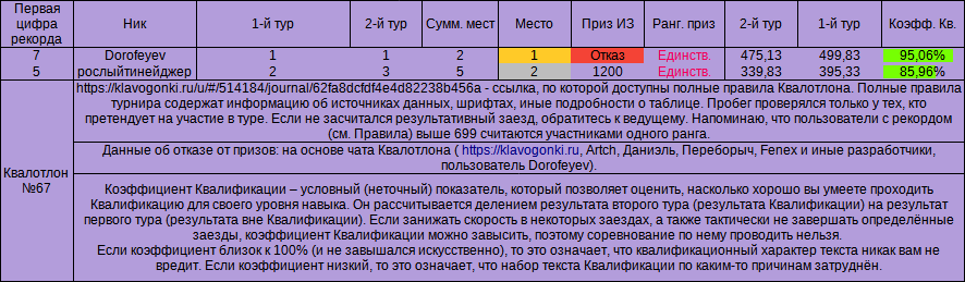 Здравствуйте! В пятницу (4 ноября), в 20-35 состоится Квалотлон №67 - гонки в Квалификации и вне неё! Обратите внимание на время начала турнира - пятница, 4 ноября, 20-35. (В России - государственный праздник.) Кратко: 1) Квалотлон, 20-35, пятница (04.11.2022); 2) 16 заездов, сначала – 6 Обычных вне Квалификации (1-й тур), затем – 9 Обычных в Квалификации (2-й тур), затем - бонус в Квалификации. 3) рекорд (Обычный) - 300+, пробег (Обычный) – 500+, 50% заездов тура позволяют попасть в зачёт тура, 2 тура - для итогового зачёта; 4) зачёт: скорость (по турам), итоговый зачёт; возможные призы: очки; 5) читерам – нет, нестандартным методам – нет. АЗ, незавершённым текстам – да. А. Проводятся 15 заездов (без учёта бонусного заезда, с его учётом — 16 заездов). Заезды №№1-6 (1-й тур) проводятся в Обычном (вне Квалификации). Остальные заезды (9 заездов 2-го тура) также проводятся в Обычном (на этот раз - в Квалификации). Дополнительный (16-й) заезд проводится в специальном словаре — https://klavogonki.ru/vocs/225631/ . Уточнение: 16-й заезд пройдёт в Квалификации. Б1. К участию допускаются только пользователи, имеющие рекорд не ниже “300” и пробег не менее 500 текстов (в обоих случаях речь про Обычный). Б2. Чтобы стать участником тура, необходимо также показать результат (определённую скорость) в 3 или 5 заездах тура (в 1-м/2-м туре соответственно). Б3. Чтобы стать участником всего турнира, необходимо поучаствовать в двух турах. В. Для подведения итогов составляются таблицы средней скорости в каждом из туров и итогового зачёта, объединяющего результаты двух туров. Г. Предусмотрено награждение по итогам каждого из туров, а также по итогам всего турнира. Организатор может не выдавать любой приз, не объясняя причины своих действий, если это не запрещено. Возможные дополнительные призы (не гарантируются): Г1) картинки для ТОП-3, Г2) ранговый приз итогового зачёта ( 1000 очков, особенности: не менее 2 человек ранга для получения, все участники с рекордом 700+ [Обычный] считаются участниками одного ранга, недопустимо опережение участником низкого ранга, есть дополнительные ограничения), Г3) суперприз. Правила турнира могут измениться. В спорных случаях решение принимает организатор; участники могут высказать своё мнение на форуме. Тайм-аут - 45 сек (120 секунд – 1-й заезд). Для удобства можно добавить Квалотлон в друзья. О суперпризе:скрытый текст… Полными правилами турнира предусмотрен суперприз. 25 000 очков - размер суперприза в Квалотлоне №67. Требуемая скорость для получения (учитываются только заезды 2-го тура!): Если ваш рекорд (далее в этом разделе речь во всех случаях про Обычный)... если ваш рекорд не больше 399, то требуемая скорость - 378. Если ваш рекорд не больше 499, то требуемая скорость - 478. Если ваш рекорд не больше 599, то требуемая скорость - 578. Если ваш рекорд не больше 699, то требуемая скорость - 656. Если ваш рекорд не больше 799, то требуемая скорость - 756. Если ваш рекорд не больше 899, то требуемая скорость - 834. Если ваш рекорд не больше 999, то требуемая скорость - 912. Если ваш рекорд не больше 1099, то требуемая скорость - 1012. Если ваш честный рекорд больше 1099, обратитесь к организатору (правилами не предусмотрены такие высокие скорости). Если вы соответствуете сразу нескольким пунктам, выбирается пункт с самой маленькой требуемой скоростью. Есть дополнительное условие - прохождение Суперподтверждения ранга. Прохождение этой процедуры подразумевает 