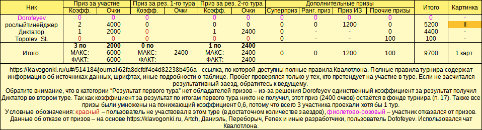 Спасибо Dorofeyev и рослыйтинейджер за участие в Квалотлоне №67! Это было необычно. На восьмом заезде было принято решение завершить турнир. С четвёртого заезда турнир шёл в дружеском режиме ради удобства входа участников. Итоги - в процессе подведения. Последний раз отредактировано 5 ноября 2022 в 00:16 пользователем Квалотлон