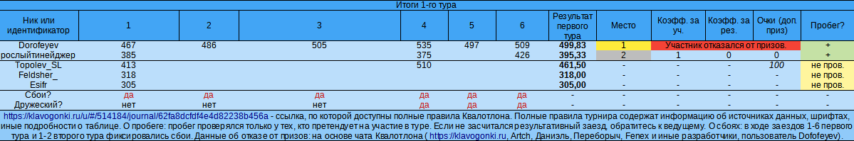 | 29. 5. 5. Если ведущего нет в течении 15 минут после предполагаемого начала турнира, турнир заканчивается преждевременно и безрезультатно (т. е. без определения участников, занявших те или иные места). | 29. 5. 6. Если возникли проблемы при сохранении, которые устранить нельзя, причём нет информации о минимум 5 заездах турнира (или о меньшем количестве, если это существенно влияет на результаты турнира), то турнир по решению ведущего может закончиться или безрезультатно, или с теми или иными корректировками результатов. | 29. 5. 7. Турниры, закончившиеся преждевременно или безрезультатно, могут быть перенесены на какой-то из следующих дней или отменены. Что будет на самом деле?Если 15 минут проводить турнир будет невозможно, турнир будет отменён. Но может оказаться, что турнир можно будет провести, просто доступ в заезды будет затруднён, но при определённых условиях возможен для всех. В этом случае турнир пройдёт так, как обычно, если будет хотя бы 1 участник. Если в заезд удастся зайти менее чем половине желающих, то стоит подумать об отмене. Если я буду пытаться провести турнир (а это вероятно), то: 1. Нужно будет добавиться в друзья к Квалотлону (при этом вам могут присылаться приглашения на этот и последующие турниры)! Иначе очень велик риск не попасть в заезды турнира. Лучше добавиться заранее, а не во время турнира. Я постараюсь проверять список друзей, но если я о нём забыл, пишите в личные сообщения или, если вы туда попали, в чате, где есть Квалотлон. 2. Если турнир состоится, ведущий может, но никому не должен применять дополнительные меры, среди которых: 1) повышение тайм-аута - первый заезд создаётся с обычным тайм-аутом, изменения возможны по итогам обсуждения в чате; 2) снижение требований для зачёта - возможно по решению ведущего после турнира для всех участников или для конкретных участников. Можете обратиться к ведущему с такой просьбой после турнира, но ведущий может отказаться. Снижение возможно максимум на 1-3 заезда (при этом хотя бы 1 заезд в туре должен быть пройден, чтобы речь шла о зачёте в туре даже на "льготных" условиях [стандартные условия, как и всегда, 3+5]); 3) отмена бонусного заезда - возможна по итогам обсуждения в чате только по причинам, связанным с массовым созданием заездов; 4) ссылки в чат на https://klavogonki.ru/gamelist - по решению ведущего (с необязательным для него обсуждением); 5) возможен переход в режим заездов "для друзей ведущего" - по итогам обсуждения в чате. Последний раз отредактировано 4 ноября 2022 в 19:25 пользователем Квалотлон