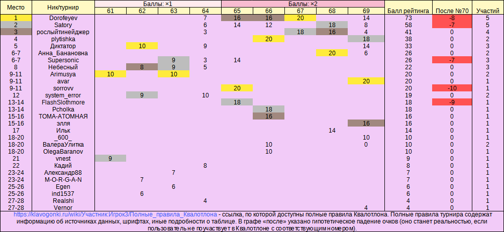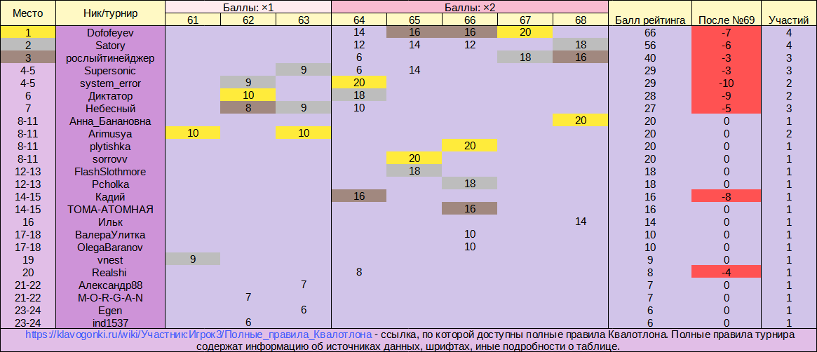 Вашему вниманию рейтинг, составленный по итогам Квалотлонов №61-68 (турнир №60,5 не учитывается): скрытый текст…  В графе «После...» указано гипотетическое падение очков (оно станет реальностью, если пользователь не поучаствует в Квалотлоне). Обратите внимание на новую систему: 10 баллов рейтинга за 1-е место, <...>, 1 балл за 10-е место, остальным - 0 баллов. Учитываются только те, кто прошёл оба тура. Баллы за последние пять турниров (в данном случае - за Квалотлоны №64-68) удваиваются. Турниров тут только 8. Как только их число дойдёт до 10, самые ранние из рейтинга станут пропадать (рейтинг составляется по последним 10 турнирам). Возродить рейтинг я попробую, но может оказаться, что обновлять его толком не получится, как нередко и было раньше. Что же касается медального зачёта, то он пока совсем не готов к публикации. Турнир - скоро (в 18-05). А пока - предвкушаем удовольствие от участия в нём). Последний раз отредактировано 26 ноября 2022 в 15:21 пользователем Игрок3