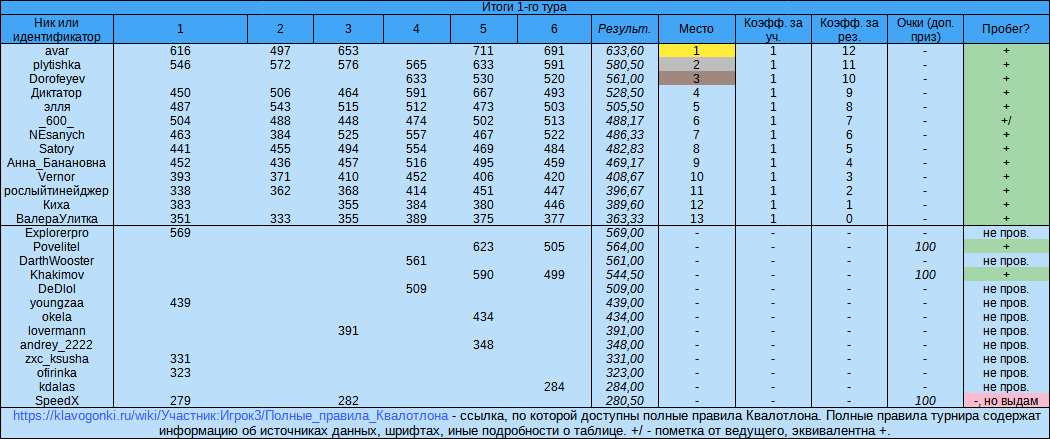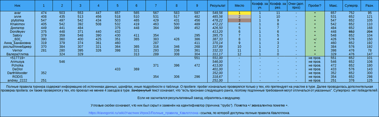 Здравствуйте! В субботу (26 ноября), в 18-05 состоится Квалотлон №69 - гонки в Квалификации и вне её! Кратко: 1) Квалотлон, 18-05, суббота (26.11.2022); 2) 15 заездов, сначала – 6 Обычных вне Квалификации (1-й тур), затем – 9 Обычных в Квалификации (2-й тур). 3) рекорд (Обычный) - 300+, пробег (Обычный) – 500+, 50% заездов тура позволяют попасть в зачёт тура, 2 тура - для итогового зачёта; 4) зачёт: скорость (по турам), итоговый зачёт; возможные призы: очки, картинки 3 лучшим; 5) читерам – нет, нестандартным методам – нет. АЗ, незавершённым текстам – да. А. Проводятся 15 заездов. Заезды №№1-6 (1-й тур) проводятся в Обычном (вне Квалификации). Остальные заезды (9 заездов 2-го тура) также проводятся в Обычном (на этот раз - в Квалификации). Б1. К участию допускаются только пользователи, имеющие рекорд не ниже “300” и пробег не менее 500 текстов (в обоих случаях речь про Обычный). Б2. Чтобы стать участником тура, необходимо также показать результат (определённую скорость) в 3 или 5 заездах тура (в 1-м/2-м туре соответственно). Б3. Чтобы стать участником всего турнира, необходимо поучаствовать в двух турах. В. Для подведения итогов составляются таблицы средней скорости в каждом из туров и итогового зачёта, объединяющего результаты двух туров. Г. Предусмотрено награждение по итогам каждого из туров, а также по итогам всего турнира. Организатор может не выдавать любой приз, не объясняя причины своих действий, если это не запрещено. Возможные дополнительные призы (не гарантируются): Г1) картинки для ТОП-3, Г2) ранговый приз итогового зачёта ( 1000 очков, особенности: не менее 2 человек ранга для получения, все участники с рекордом 700+ [Обычный] считаются участниками одного ранга, недопустимо опережение участником низкого ранга, есть дополнительные ограничения), Г3) суперприз. Правила турнира могут измениться. В спорных случаях решение принимает организатор; участники могут высказать своё мнение на форуме. Тайм-аут - 45 сек (120 секунд – 1-й заезд). Для удобства можно добавить Квалотлон в друзья. О суперпризе:скрытый текст… Полными правилами турнира предусмотрен суперприз. 33 333 очка - размер суперприза в Квалотлоне №69. Требуемая скорость для получения (учитываются только заезды 2-го тура!): Если ваш рекорд (далее в этом разделе речь во всех случаях про Обычный)... если ваш рекорд не больше 399, то требуемая скорость - 376. Если ваш рекорд не больше 499, то требуемая скорость - 476. Если ваш рекорд не больше 599, то требуемая скорость - 576. Если ваш рекорд не больше 699, то требуемая скорость - 652. Если ваш рекорд не больше 799, то требуемая скорость - 752. Если ваш рекорд не больше 899, то требуемая скорость - 828. Если ваш рекорд не больше 999, то требуемая скорость - 904. Если ваш рекорд не больше 1099, то требуемая скорость - 1004. Если ваш честный рекорд больше 1099, обратитесь к организатору или к полным правилам, чтобы узнать требование. Если вы соответствуете сразу нескольким пунктам, выбирается пункт с самой маленькой требуемой скоростью. Если требования для получения суперприза слишком высоки, подождите - в каждом следующем турнире требования чуть-чуть снижаются. Это продолжается до тех пор, пока не появится победитель, после чего счётчик возвращается к своему исходному состоянию. Есть дополнительное условие - прохождение Суперподтверждения ранга. Прохождение этой процедуры подразумевает соответствие большому количеству условий, в основно
