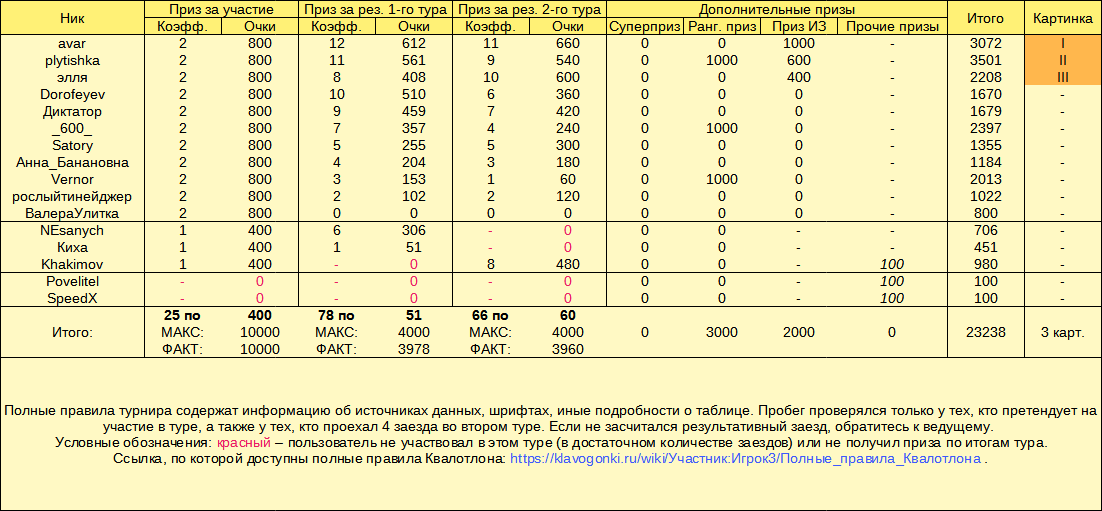 Статус: итоги подведены, очки выданы, картинки для ТОП-3 выданы. Если какого-то обещанного приза у вас нет, сообщите ведущему. Пользователи, которые запретили выдачу призов: - Киха - 451 очко за 12-е место по итогам первого тура. Участник не связался с Квалотлоном, поэтому приз остаётся в фонде турнира.