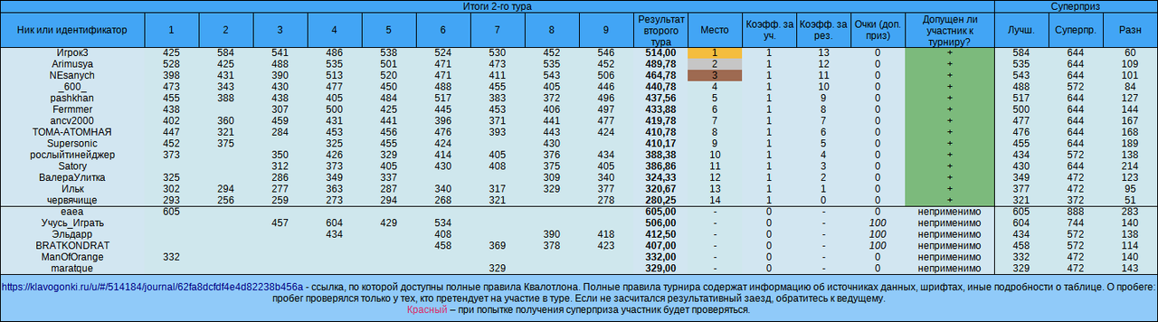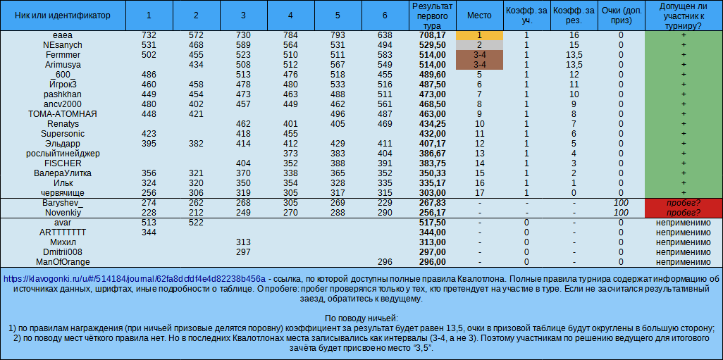 1. В этом турнире, если он проводится (полу-)автоматически, предусмотрены предварительные итоги. Ведущий считает их благом для турнира. Если вас не устраивает это, следуйте одному из советов: 1) не пользуйтесь средствами для общения на турнире (через них ведущий публикует предытоги); 2) с помощью скриптов запретите получение сообщений от ведущего; 3) с помощью скриптов запретите получение сообщений с результатами (скорее всего, скриптов для такого выборочного запрета пока нет). К сожалению, следование этим советам может привести к снижению вашего комфорта при участии в турнире, но ведущий не может ничего сделать. Ведущий надеется, что публикация предытогов не станет причиной для отказа от участия в Квалотлоне. 2. Значок {!} в предварительных итогах может появиться только во втором туре. Он означает, что участник не прошёл достаточного количества заездов в первом туре, но может выполнить требование во втором туре. В одном из туров можно участвовать независимо от другого. 3. Участники, которые не могут (даже теоретически) набрать необходимого количества заездов в данном туре, автоматически исключаются из предварительных итогов тура. Если участник не попадает (не попал) в предварительные итоги первого тура, он сохраняет возможность участия - участия только во втором туре [по решению ведущего возможны изменения, в том числе ведущий может дать разрешение на участие в первом туре]. 4. На момент написания этого текста требования таковы: 3 заезда в первом туре и 5 заездов во втором туре, но они могут измениться. 5. Предварительные итоги учитывают результаты заездов, пройденных до данного. В ходе заездов публикуются предварительные итоги того тура, который проводился на момент завершения предыдущего заезда (при том в самом конце турнира публикуются дополнительные предварительные итоги). 6. Предварительные итоги не являются окончательными итогами, ведущий может внести определённые коррективы. О неработоспособности сайта: скрытый текст… Если игра по каким-то причинам не работает, то ждем 15 минут. Если 15 минут прошло, игра заканчивается, даже если через 20 минут после поломки все опять заработало. Если игра была закончена преждевременно, она переносится или отменяется. Если возникли проблемы с сохранениями, турнир может быть перенесён или отменён. Следите за форумом, там все будет написано! О сомнительных результатах:скрытый текст… Читерство запрещено. АЗ разрешены, если (так как) текст неизвестен заранее. Разрешено не завершать печать, чтобы повысить результат, но это может привести к незачёту результатов. Нестандартные методы набора могут не соответствовать правилам (проверяется сходство устройства наборщика и значения слова «клавиатура»). Игра с клона разрешена лишь тогда, когда она не вводит в заблуждение организатора (особенно серьёзное недовольство могут вызвать попытки получить суперприз, использовав клона для нечестного снижения ранга). Надеюсь на честность всех участников!