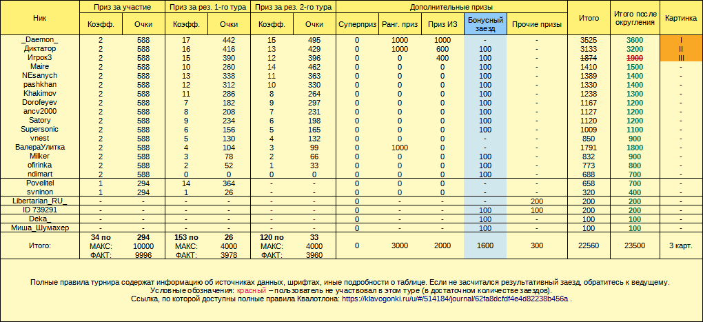 Итоги Квалотлона №77 1-й тур 2-й тур Итоговый зачёт Бонусный заезд Призовой фонд То же самое на внешнем ресурсе, хостинг Примечание: Xeerio111 получит дополнительные 100 очков, не отражённые в таблицах, по итогам Квалотлона №77. Примечание 2: в таблице призов сломано суммирование, из-за чего не учлись 400 очков. Верная сумма призов должна быть на 400 очков больше, таким образом, суммарно будет потрачено на 500 очков больше, чем указано в таблицах. Статус турнира: таблицы готовы, рейтинг - отложен на неопределённый срок, очки - выданы, картинки - выданы. Если что-то не получили, пишите Квалотлону. Пользователи, запретившие выдачу призов: svninon и Xeerio111. Если нужны призы, просьба выполнить ДВА действия: 1) добавить ведущего турнира в друзья и убедиться, что он может выдавать призы; 2) обратиться в личные сообщения с просьбой выдать приз. Это нужно сделать до 27.01.2023 23:59:59, иначе ведущий оставит призы в фонде турнира. Спасибо за участие в Квалотлоне №77! Последний раз отредактировано 22 января 2023 в 18:26 пользователем Квалотлон