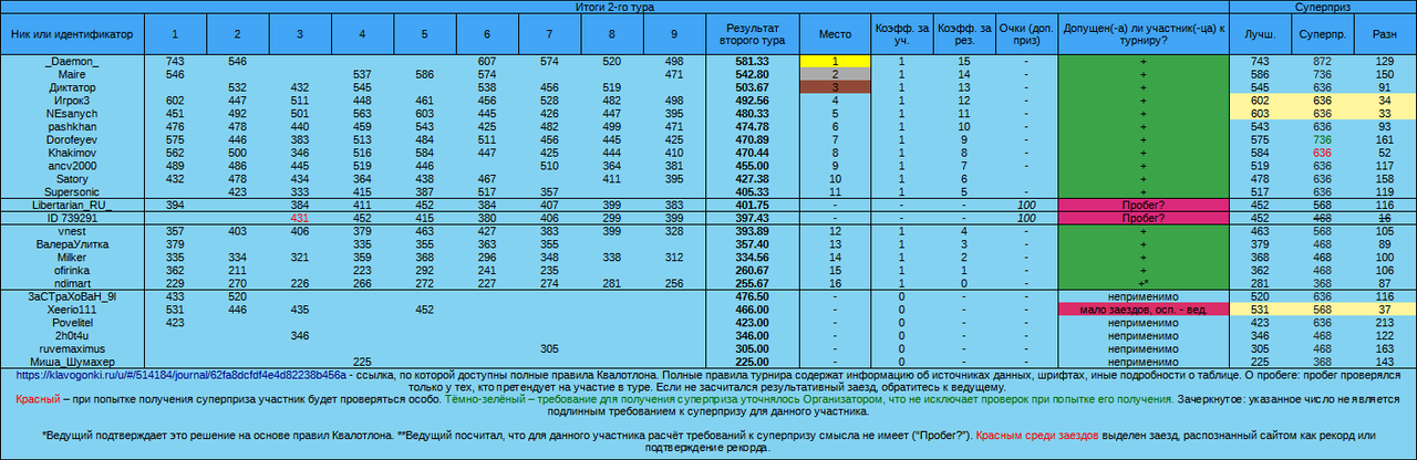 Добро пожаловать в невероятный мир турнира «Квалотлон»! Квалотлон — это турнир, это суббота ( 21 января), это 18:05, это 15 заездов, это Квалификация и не только она.  Как поучаствовать в турнире? Выполнить 5 обязательных требований к участнику Квалотлона: 1) зайти в заезды, которые создаёт Квалотлон (можно добавить в друзья для удобства). Искать заезды нужно в 18-05 21 января 2023 года; 2) пройти в первом туре 3 «обычных» заезда (из 6 создаваемых ведущим); 3) успешно пройти во втором туре 5 «квалификационных» заездов (из 9 создаваемых ведущим, текст — тоже «обычный», но картинка); 4) иметь рекорд в «обычных» заездах, который не меньше 300 (до турнира); 5) иметь пробег в «обычных» заездах, который не меньше 500 (на момент подсчёта); Турнир проходит автоматически? Сейчас — да. Если турнир проходит автоматически, к участникам выдвигается ещё одно требование. Необходимо успевать допечатать текст достаточно быстро. В первом туре — за 1,5 минуты. Во втором туре — за 110 секунд (либо за 105 секунд чистого времени при ошибках). Какие ещё требования к участнику Квалотлона есть? Что может делать ведущий турнира? Честная игра (в том числе ранговая) и соблюдение правил общения и сайта, само собой, тоже обязательны — настолько обязательны, что выше прописывать это требование ведущий даже не стал. Трактовка правил и спорных случаев, добавление, удаление и изменение правил и результатов, в том числе постфактум, остаются за ведущим. Ведущий может не выдавать призы и не заниматься организаторскими действиями, не объясняя причин. Ведущий может запрещать пользователям участвовать (получать призы и попадать в таблицы) — вплоть до полного запрета на участие во всех турнирах Квалотлона. Как определяется победитель? В туре — по средней скорости. В турнире — по сумме мест за 1-й и 2-й туры (меньше — лучше). Какие награды за участие есть? За участие хотя бы в одном туре (при обязательном выполнении требований к участнику Квалотлона под номерами 1, 4 и 5) — приз очками (но лучше поучаствовать в обоих, чтобы очков было больше). За попадание в тройку сильнейших по итогам двух туров (все требования в силе) — картинка от Квалотлона в бортовой журнал и дополнительные очки. Дополнительные призы — ранговый приз и суперприз. Призовой фонд турнира без учёта суперприза — ок. 18-27 тысяч очков. Суперприз... Что это? скрытый текст… Суперприз — это приз за один заезд второго тура (то есть за заезд Квалификации), пройденный очень быстро. Действует только во втором туре. В Квалотлоне №77 размер суперприза — 99 999 очков. С каждым турниром (со стандартным номером) требуемая для получения суперприза скорость чуть-чуть снижается (до момента выигрыша, после которого все начинается сначала). Суперприз выдаётся только участникам, которые соответствуют доп. требованиям к рангу и честности результатов. Ознакомьтесь с информацией о суперпризе: 1. Таблица требований к скорости для получения этого приза. 2. Формула, по которой определяется требуемая скорость, а также другие правила. 3. Что такое Суперподтверждение? - оно тоже необходимо для выдачи этого приза (ссылка ведёт на полные правила, не вся информация по ссылке связана с Суперподтверждением). Скорость, которая нужна во втором туре Квалотлона №77 (достаточно одного заезда при соблюдении других требований): Если ваш рекорд (далее в этом разделе речь во всех случаях про О