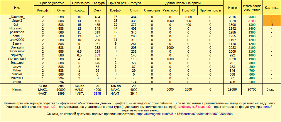 Добро пожаловать в невероятный мир турнира «Квалотлон»! Квалотлон — это турнир, это суббота ( 28 января), это 18:05, это 15 заездов, это Квалификация и не только она.  Как поучаствовать в турнире? Выполнить 5 обязательных требований к участнику Квалотлона: 1) зайти в заезды, которые создаёт Квалотлон (можно добавить в друзья для удобства). Искать заезды нужно в 18-05 28 января 2023 года; 2) пройти в первом туре 3 «обычных» заезда (из 6 создаваемых ведущим); 3) успешно пройти во втором туре 5 «квалификационных» заездов (из 9 создаваемых ведущим, текст — тоже «обычный», но картинка); 4) иметь рекорд в «обычных» заездах, который не меньше 300 (до турнира); 5) иметь пробег в «обычных» заездах, который не меньше 500 (на момент подсчёта); Турнир проходит автоматически? Сейчас — да. Если турнир проходит автоматически, к участникам выдвигается ещё одно требование. Необходимо успевать допечатать текст достаточно быстро. В первом туре — за 1,5 минуты. Во втором туре — за 110 секунд (либо за 105 секунд чистого времени при ошибках). Какие ещё требования к участнику Квалотлона есть? Что может делать ведущий турнира? Честная игра (в том числе ранговая) и соблюдение правил общения и сайта, само собой, тоже обязательны — настолько обязательны, что выше прописывать это требование ведущий даже не стал. Трактовка правил и спорных случаев, добавление, удаление и изменение правил и результатов, в том числе постфактум, остаются за ведущим. Ведущий может не выдавать призы и не заниматься организаторскими действиями, не объясняя причин. Ведущий может запрещать пользователям участвовать (получать призы и попадать в таблицы) — вплоть до полного запрета на участие во всех турнирах Квалотлона. Как определяется победитель? В туре — по средней скорости. В турнире — по сумме мест за 1-й и 2-й туры (меньше — лучше). Какие награды за участие есть? За участие хотя бы в одном туре (при обязательном выполнении требований к участнику Квалотлона под номерами 1, 4 и 5) — приз очками (но лучше поучаствовать в обоих, чтобы очков было больше). За попадание в тройку сильнейших по итогам двух туров (все требования в силе) — картинка от Квалотлона в бортовой журнал и дополнительные очки. Дополнительные призы — ранговый приз и суперприз. Призовой фонд турнира без учёта суперприза — ок. 18-27 тысяч очков. Суперприз... Что это? скрытый текст… Суперприз — это приз за один заезд второго тура (то есть за заезд Квалификации), пройденный очень быстро. Действует только во втором туре. В Квалотлоне №78 размер суперприза — 99 999 очков. С каждым турниром (со стандартным номером) требуемая для получения суперприза скорость чуть-чуть снижается (до момента выигрыша, после которого все начинается сначала). Суперприз выдаётся только участникам, которые соответствуют доп. требованиям к рангу и честности результатов. Ознакомьтесь с информацией о суперпризе: 1. Таблица требований к скорости для получения этого приза. 2. Формула, по которой определяется требуемая скорость, а также другие правила. 3. Что такое Суперподтверждение? - оно тоже необходимо для выдачи этого приза (ссылка ведёт на полные правила, не вся информация по ссылке связана с Суперподтверждением). Скорость, которая нужна во втором туре Квалотлона №78 (достаточно одного заезда при соблюдении других требований): Если ваш рекорд (далее в этом разделе речь во всех случаях про О