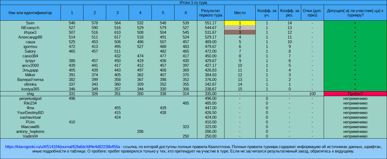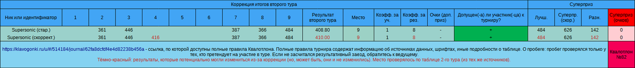 Добро пожаловать в невероятный мир турнира «Квалотлон»! Квалотлон — это турнир, это суббота ( 25 февраля), это 18:05, это 15 заездов, это Квалификация и не только она.  Как поучаствовать в турнире? Выполнить 5 обязательных требований к участнику Квалотлона: 1) зайти в заезды, которые создаёт Квалотлон (можно добавить в друзья для удобства). Искать заезды нужно в 18-05 25 февраля 2023 года; 2) пройти в первом туре 3 «обычных» заезда (из 6 создаваемых ведущим); 3) успешно пройти во втором туре 5 «квалификационных» заездов (из 9 создаваемых ведущим, текст — тоже «обычный», но картинка); 4) иметь рекорд в «обычных» заездах, который не меньше 300 (до турнира); 5) иметь пробег в «обычных» заездах, который не меньше 500 (на момент подсчёта); Турнир проходит автоматически? Сейчас — да. Если турнир проходит автоматически, к участникам выдвигается ещё одно требование. Необходимо успевать допечатать текст достаточно быстро. В первом туре — за 1,5 минуты. Во втором туре — за 110 секунд (либо за 105 секунд чистого времени при ошибках). Какие ещё требования к участнику Квалотлона есть? Что может делать ведущий турнира? Честная игра (в том числе ранговая) и соблюдение правил общения и сайта, само собой, тоже обязательны — настолько обязательны, что выше прописывать это требование ведущий даже не стал. Трактовка правил и спорных случаев, добавление, удаление и изменение правил и результатов, в том числе постфактум, остаются за ведущим. Ведущий может не выдавать призы и не заниматься организаторскими действиями, не объясняя причин. Ведущий может запрещать пользователям участвовать (получать призы и попадать в таблицы) — вплоть до полного запрета на участие во всех турнирах Квалотлона. Как определяется победитель? В туре — по средней скорости. В турнире — по сумме мест за 1-й и 2-й туры (меньше — лучше). Какие награды за участие есть? За участие хотя бы в одном туре (при обязательном выполнении требований к участнику Квалотлона под номерами 1, 4 и 5) — приз очками (но лучше поучаствовать в обоих, чтобы очков было больше). За попадание в тройку сильнейших по итогам двух туров (все требования в силе) — картинка от Квалотлона в бортовой журнал и дополнительные очки. Дополнительные призы — ранговый приз и суперприз. Призовой фонд турнира без учёта суперприза — ок. 18-27 тысяч очков. Суперприз... Что это? скрытый текст… Суперприз — это приз за один заезд второго тура (то есть за заезд Квалификации), пройденный очень быстро. Действует только во втором туре. В Квалотлоне №82 размер суперприза — 99 999 очков. С каждым турниром (со стандартным номером) требуемая для получения суперприза скорость чуть-чуть снижается (до момента выигрыша, после которого все начинается сначала). Суперприз выдаётся только участникам, которые соответствуют доп. требованиям к рангу и честности результатов. Ознакомьтесь с информацией о суперпризе: 1. Таблица требований к скорости для получения этого приза. 2. Формула, по которой определяется требуемая скорость, а также другие правила. 3. Что такое Суперподтверждение? - оно тоже необходимо для выдачи этого приза (ссылка ведёт на полные правила, не вся информация по ссылке связана с Суперподтверждением). Скорость, которая нужна во втором туре Квалотлона №82 (достаточно одного заезда при соблюдении других требований): Если ваш рекорд (далее в этом разделе речь во всех случаях пр