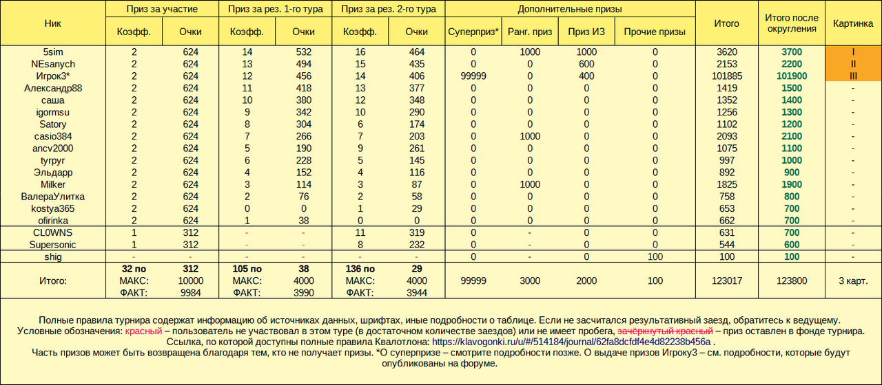 Ура, суперприз разыгран! Поздравляю Игрока3 (то есть себя :D) с суперпризом - 99 999 очков! _________________________ СУПЕРПРИЗ!!! 99 999 очков _________________________ Игрок3 также пополняет список Мастеров Квалификации. Со следующего Квалотлона требуемая скорость для суперприза опять возвращается на отметку 400/500/600/700/800 зн/мин; новый суперприз составит 10 000 очков.