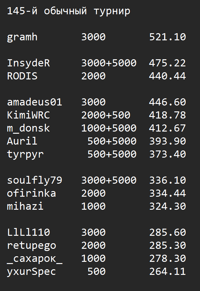 145-й обычный турнир [hide][url="https://fastpic.org/view/127/2026/0301/255a8a6a4334cb69555c7b716b14a9d3.png.html"][img]https://i127.fastpic.org/big/2026/0301/d3/255a8a6a4334cb69555c7b716b14a9d3.png[/img][/url][/hide] [hide][url="https://fastpic.org/view/127/2026/0301/3bdcc50f880c69418a67d5bd858d5981.png.html"][img]https://i127.fastpic.org/big/2026/0301/81/3bdcc50f880c69418a67d5bd858d5981.png[/img][/url][/hide]