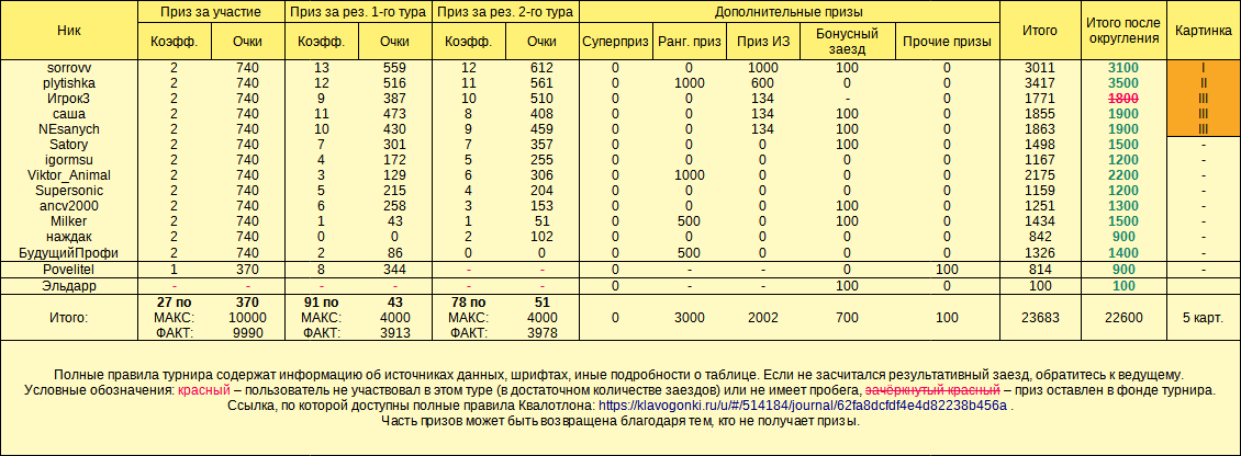 Итоги Квалотлона №83 1-й тур 2-й тур скрытый текст…  *По поводу доп. призов - см. таблицу "Призовой фонд", а не эту таблицу. Бонусный заезд Итоговый зачёт скрытый текст…  Да уж...) Призовой фонд То же самое на внешнем ресурсе, хостинг Статус турнира: таблицы готовы, рейтинг - отложен на неопределённый срок, очки - выданы, картинки - выданы. Если что-то не получили, пишите Квалотлону. Спасибо за участие в Квалотлоне №83! Последний раз отредактировано 5 марта 2023 в 11:40 пользователем Квалотлон