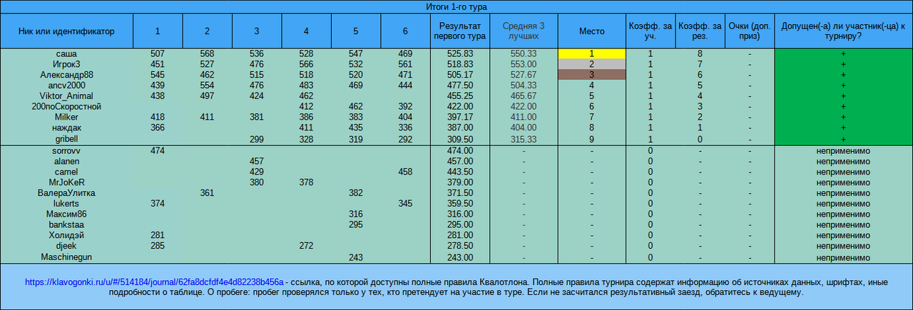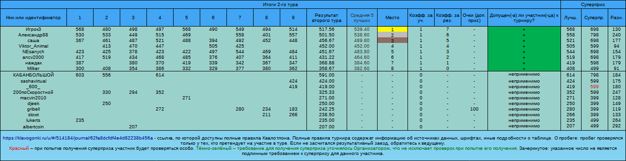 Добро пожаловать в невероятный мир турнира «Квалотлон»! Квалотлон — это турнир, это суббота ( 11 марта), это 18:05, это 15 заездов, это Квалификация и не только она.  Как поучаствовать в турнире? Выполнить 5 обязательных требований к участнику Квалотлона: 1) зайти в заезды, которые создаёт Квалотлон (можно добавить в друзья для удобства). Искать заезды нужно в 18-05 11 марта 2023 года; 2) пройти в первом туре 3 «обычных» заезда (из 6 создаваемых ведущим); 3) успешно пройти во втором туре 5 «квалификационных» заездов (из 9 создаваемых ведущим, текст — тоже «обычный», но картинка); 4) иметь рекорд в «обычных» заездах, который не меньше 300 (до турнира); 5) иметь пробег в «обычных» заездах, который не меньше 500 (на момент подсчёта); Турнир проходит автоматически? Сейчас — да. Если турнир проходит автоматически, к участникам выдвигается ещё одно требование. Необходимо успевать допечатать текст достаточно быстро. В первом туре — за 1,5 минуты. Во втором туре — за 110 секунд общего времени ( включает в себя все паузы). Какие ещё требования к участнику Квалотлона есть? Что может делать ведущий турнира? Честная игра (в том числе ранговая) и соблюдение правил общения и сайта, само собой, тоже обязательны — настолько обязательны, что выше прописывать это требование ведущий даже не стал. Трактовка правил и спорных случаев, добавление, удаление и изменение правил и результатов, в том числе постфактум, остаются за ведущим. Ведущий может не выдавать призы и не заниматься организаторскими действиями, не объясняя причин. Ведущий может запрещать пользователям участвовать (получать призы и попадать в таблицы) — вплоть до полного запрета на участие во всех турнирах Квалотлона. Как определяется победитель? В туре — по средней скорости. В турнире — по сумме мест за 1-й и 2-й туры (меньше — лучше). Какие награды за участие есть? За участие хотя бы в одном туре (при обязательном выполнении требований к участнику Квалотлона под номерами 1, 4 и 5) — приз очками (но лучше поучаствовать в обоих, чтобы очков было больше). За попадание в тройку сильнейших по итогам двух туров (все требования в силе) — картинка от Квалотлона в бортовой журнал и дополнительные очки. Дополнительные призы — ранговый приз и суперприз. Призовой фонд турнира без учёта суперприза — ок. 18-27 тысяч очков. Суперприз... Что это? скрытый текст… Суперприз — это приз за один заезд второго тура (то есть за заезд Квалификации), пройденный очень быстро. Действует только во втором туре. В Квалотлоне №84 размер суперприза — 10 000 очков. С каждым турниром (со стандартным номером) требуемая для получения суперприза скорость чуть-чуть снижается (до момента выигрыша, после которого все начинается сначала). Суперприз выдаётся только участникам, которые соответствуют доп. требованиям к рангу и честности результатов. Ознакомьтесь с информацией о суперпризе: 1. Таблица требований к скорости для получения этого приза. 2. Формула, по которой определяется требуемая скорость, а также другие правила. 3. Что такое Суперподтверждение? - оно тоже необходимо для выдачи этого приза (ссылка ведёт на полные правила, не вся информация по ссылке связана с Суперподтверждением). Скорость, которая нужна во втором туре Квалотлона №84 (достаточно одного заезда при соблюдении других требований): Если ваш рекорд (далее в этом разделе речь во всех случаях про Обычны