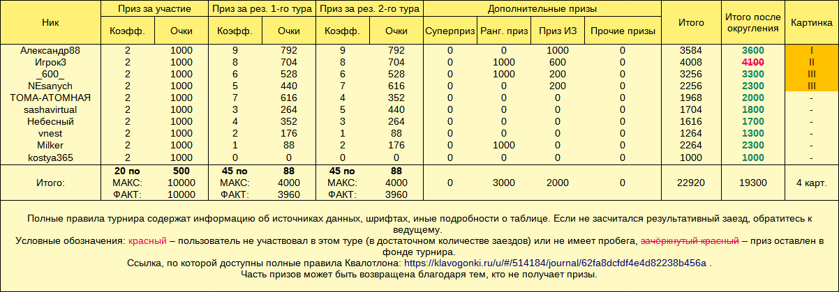 Добро пожаловать в невероятный мир турнира «Квалотлон»! Квалотлон — это турнир, это суббота ( 22 апреля), это 18:05, это 15 заездов, это Квалификация и не только она.  Как поучаствовать в турнире? Выполнить 5 обязательных требований к участнику Квалотлона: 1) зайти в заезды, которые создаёт Квалотлон (можно добавить в друзья для удобства). Искать заезды нужно в 18-05 22 апреля 2023 года; 2) пройти в первом туре 3 «обычных» заезда (из 6 создаваемых ведущим); 3) успешно пройти во втором туре 5 «квалификационных» заездов (из 9 создаваемых ведущим, текст — тоже «обычный», но картинка); 4) иметь рекорд в «обычных» заездах, который не меньше 300 (до турнира); 5) иметь пробег в «обычных» заездах, который не меньше 500 (на момент подсчёта); Турнир проходит автоматически? Сейчас — да. Если турнир проходит автоматически, к участникам выдвигается ещё одно требование. Необходимо успевать допечатать текст достаточно быстро. В первом туре — за 1,5 минуты. Во втором туре — за 110 секунд общего времени ( включает в себя все паузы). Какие ещё требования к участнику Квалотлона есть? Что может делать ведущий турнира? Честная игра (в том числе ранговая) и соблюдение правил общения и сайта, само собой, тоже обязательны — настолько обязательны, что выше прописывать это требование ведущий даже не стал. Трактовка правил и спорных случаев, добавление, удаление и изменение правил и результатов, в том числе постфактум, остаются за ведущим. Ведущий может не выдавать призы и не заниматься организаторскими действиями, не объясняя причин. Ведущий может запрещать пользователям участвовать (получать призы и попадать в таблицы) — вплоть до полного запрета на участие во всех турнирах Квалотлона. Как определяется победитель? В туре — по средней скорости. В турнире — по сумме мест за 1-й и 2-й туры (меньше — лучше). Какие награды за участие есть? За участие хотя бы в одном туре (при обязательном выполнении требований к участнику Квалотлона под номерами 1, 4 и 5) — приз очками (но лучше поучаствовать в обоих, чтобы очков было больше). За попадание в тройку сильнейших по итогам двух туров (все требования в силе) — картинка от Квалотлона в бортовой журнал и дополнительные очки. Дополнительные призы — ранговый приз и суперприз. Призовой фонд турнира без учёта суперприза — ок. 18-27 тысяч очков. Суперприз... Что это? скрытый текст… Суперприз — это приз за один заезд второго тура (то есть за заезд Квалификации), пройденный очень быстро. Действует только во втором туре. В Квалотлоне №89 размер суперприза — 10 000 очков. С каждым турниром (со стандартным номером) требуемая для получения суперприза скорость чуть-чуть снижается (до момента выигрыша, после которого все начинается сначала). Суперприз выдаётся только участникам, которые соответствуют доп. требованиям к рангу и честности результатов. Ознакомьтесь с информацией о суперпризе: 1. Таблица требований к скорости для получения этого приза. 2. Формула, по которой определяется требуемая скорость, а также другие правила. 3. Что такое Суперподтверждение? - оно тоже необходимо для выдачи этого приза (ссылка ведёт на полные правила, не вся информация по ссылке связана с Суперподтверждением). Скорость, которая нужна во втором туре Квалотлона №89 (достаточно одного заезда при соблюдении других требований): Если ваш рекорд (далее в этом разделе речь во всех случаях про Обыч