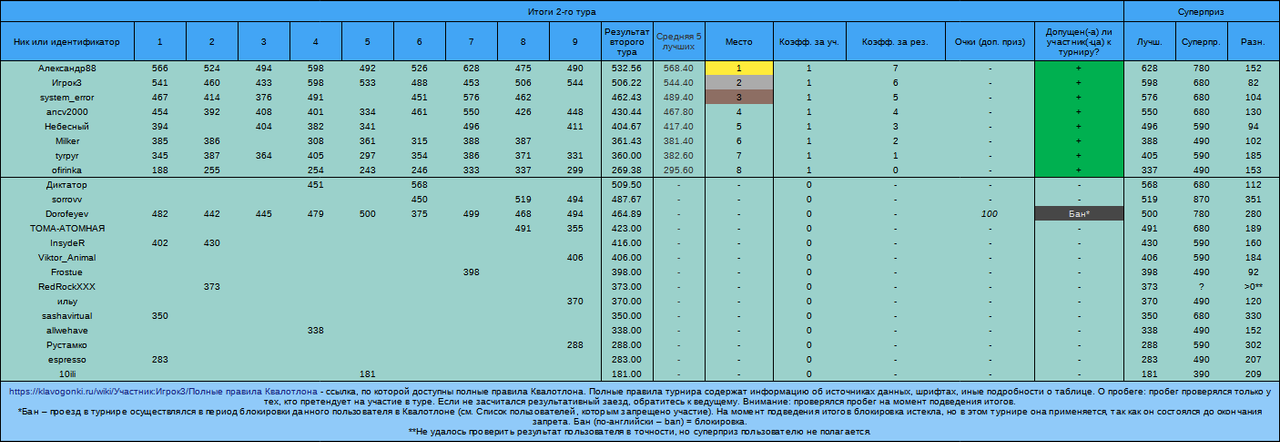 Добро пожаловать в невероятный мир турнира «Квалотлон»! Квалотлон — это турнир, это суббота ( 27 мая), это 20:35, это 15 заездов, это Квалификация и не только она.  Как поучаствовать в турнире? Выполнить 5 обязательных требований к участнику Квалотлона: 1) зайти в заезды, которые создаёт Квалотлон (можно добавить в друзья для удобства). Искать заезды нужно в 20-35 27 мая 2023 года; 2) пройти в первом туре 3 «обычных» заезда (из 6 создаваемых ведущим); 3) успешно пройти во втором туре 5 «квалификационных» заездов (из 9 создаваемых ведущим, текст — тоже «обычный», но картинка); 4) иметь рекорд в «обычных» заездах, который не меньше 300 (до турнира); 5) иметь пробег в «обычных» заездах, который не меньше 500 (на момент подсчёта); Турнир проходит автоматически? Сейчас — да. Если турнир проходит автоматически, к участникам выдвигается ещё одно требование. Необходимо успевать допечатать текст достаточно быстро. В первом туре — за 1,5 минуты. Во втором туре — за 110 секунд общего времени ( включает в себя все паузы). Какие ещё требования к участнику Квалотлона есть? Что может делать ведущий турнира? Честная игра (в том числе ранговая) и соблюдение правил общения и сайта, само собой, тоже обязательны — настолько обязательны, что выше прописывать это требование ведущий даже не стал. Трактовка правил и спорных случаев, добавление, удаление и изменение правил и результатов, в том числе постфактум, остаются за ведущим. Ведущий может не выдавать призы и не заниматься организаторскими действиями, не объясняя причин. Ведущий может запрещать пользователям участвовать (получать призы и попадать в таблицы) — вплоть до полного запрета на участие во всех турнирах Квалотлона. Как определяется победитель? В туре — по средней скорости. В турнире — по сумме мест за 1-й и 2-й туры (меньше — лучше). Какие награды за участие есть? За участие хотя бы в одном туре (при обязательном выполнении требований к участнику Квалотлона под номерами 1, 4 и 5) — приз очками (но лучше поучаствовать в обоих, чтобы очков было больше). За попадание в тройку сильнейших по итогам двух туров (все требования в силе) — картинка от Квалотлона в бортовой журнал и дополнительные очки. Дополнительные призы — ранговый приз и суперприз. Призовой фонд турнира без учёта суперприза — ок. 18-27 тысяч очков. Суперприз... Что это? скрытый текст… Суперприз — это приз за один заезд второго тура (то есть за заезд Квалификации), пройденный очень быстро. Действует только во втором туре. В Квалотлоне №93 размер суперприза — 10 000 очков. С каждым турниром (со стандартным номером) требуемая для получения суперприза скорость чуть-чуть снижается (до момента выигрыша, после которого все начинается сначала). Суперприз выдаётся только участникам, которые соответствуют доп. требованиям к рангу и честности результатов. Ознакомьтесь с информацией о суперпризе: 1. Таблица требований к скорости для получения этого приза. 2. Формула, по которой определяется требуемая скорость, а также другие правила. 3. Что такое Суперподтверждение? - оно тоже необходимо для выдачи этого приза (ссылка ведёт на полные правила, не вся информация по ссылке связана с Суперподтверждением). Скорость, которая нужна во втором туре Квалотлона №93 (достаточно одного заезда при соблюдении других требований): Если ваш рекорд (далее в этом разделе речь во всех случаях про Обычный)... е
