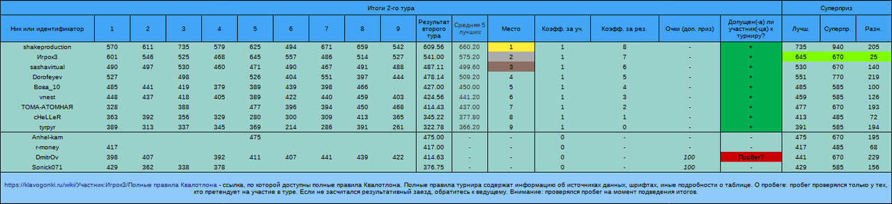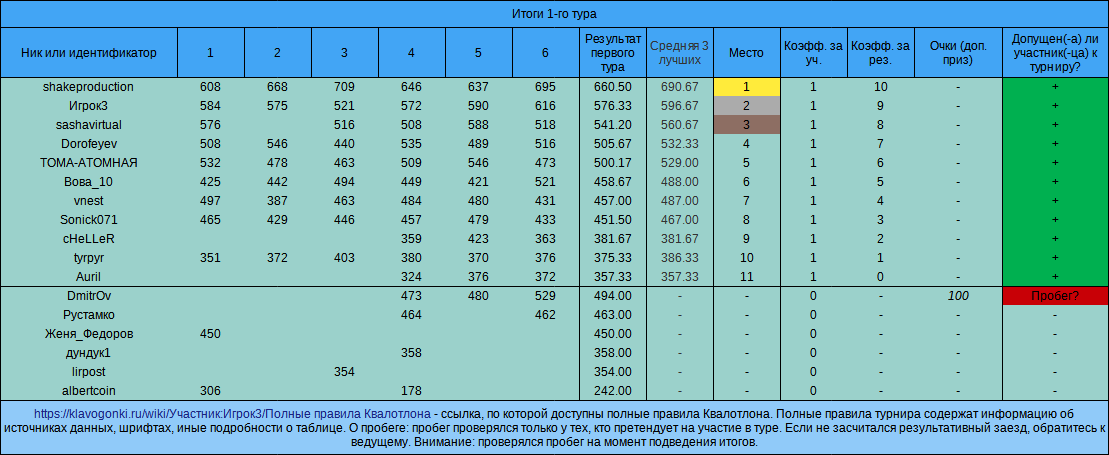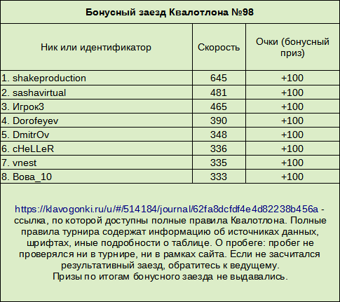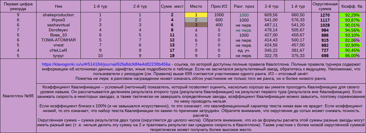 Добро пожаловать в невероятный мир турнира «Квалотлон»! Квалотлон — это турнир, это суббота ( 8 июля), это 20:35, это 15 заездов, это Квалификация и не только она.  Как поучаствовать в турнире? Выполнить 5 обязательных требований к участнику Квалотлона: 1) зайти в заезды, которые создаёт Квалотлон (можно добавить в друзья для удобства). Искать заезды нужно в 20-35 8 июля 2023 года; 2) пройти в первом туре 3 «обычных» заезда (из 6 создаваемых ведущим); 3) успешно пройти во втором туре 5 «квалификационных» заездов (из 9 создаваемых ведущим, текст — тоже «обычный», но картинка); 4) иметь рекорд в «обычных» заездах, который не меньше 300 (до турнира); 5) иметь пробег в «обычных» заездах, который не меньше 500 (на момент подсчёта); Турнир проходит автоматически? Сейчас — да. Если турнир проходит автоматически, к участникам выдвигается ещё одно требование. Необходимо успевать допечатать текст достаточно быстро. В первом туре — за 1,5 минуты. Во втором туре — за 110 секунд общего времени ( включает в себя все паузы). Какие ещё требования к участнику Квалотлона есть? Что может делать ведущий турнира? Честная игра (в том числе ранговая) и соблюдение правил общения и сайта, само собой, тоже обязательны — настолько обязательны, что выше прописывать это требование ведущий даже не стал. Трактовка правил и спорных случаев, добавление, удаление и изменение правил и результатов, в том числе постфактум, остаются за ведущим. Ведущий может не выдавать призы и не заниматься организаторскими действиями, не объясняя причин. Ведущий может запрещать пользователям участвовать (получать призы и попадать в таблицы) — вплоть до полного запрета на участие во всех турнирах Квалотлона. Как определяется победитель? В туре — по средней скорости. В турнире — по сумме мест за 1-й и 2-й туры (меньше — лучше). Какие награды за участие есть? За участие хотя бы в одном туре (при обязательном выполнении требований к участнику Квалотлона под номерами 1, 4 и 5) — приз очками (но лучше поучаствовать в обоих, чтобы очков было больше). За попадание в тройку сильнейших по итогам двух туров (все требования в силе) — картинка от Квалотлона в бортовой журнал и дополнительные очки. Дополнительные призы — ранговый приз и суперприз. Призовой фонд турнира без учёта суперприза — ок. 18-27 тысяч очков. Суперприз... Что это? скрытый текст… Суперприз — это приз за один заезд второго тура (то есть за заезд Квалификации), пройденный очень быстро. Действует только во втором туре. В Квалотлоне №98 размер суперприза — 10 000 очков. С каждым турниром (со стандартным номером) требуемая для получения суперприза скорость чуть-чуть снижается (до момента выигрыша, после которого все начинается сначала). Суперприз выдаётся только участникам, которые соответствуют доп. требованиям к рангу и честности результатов. Ознакомьтесь с информацией о суперпризе: 1. Таблица требований к скорости для получения этого приза. 2. Формула, по которой определяется требуемая скорость, а также другие правила. 3. Что такое Суперподтверждение? - оно тоже необходимо для выдачи этого приза (ссылка ведёт на полные правила, не вся информация по ссылке связана с Суперподтверждением). Скорость, которая нужна во втором туре Квалотлона №98 (достаточно одного заезда при соблюдении других требований): Если ваш рекорд (далее в этом разделе речь во всех случаях про Обычный)... 
