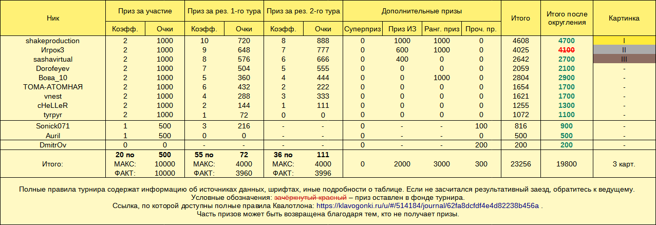 Итоги Квалотлона №98 1-й тур 2-й тур Итоговый зачёт Призовой фонд Бонусный заезд скрытый текст…  Призы будут выданы в дополнение к призам, указанным в предыдущей таблице. Ссылка на хостинг Статус: 1) очки — выданы; 2) картинки — выданы; 3) рейтинг — отложен на неопределенный срок; 4) таблицы — составлены. Спасибо за участие в Квалотлоне №98! Подсчитано с помощью Квалотлон-AutoCount ( автоматический подсчёт) - программы от Игрока3, созданной целиком в электронных таблицах. В программе могут присутствовать ошибки, если они повлияли на подведение итогов, сообщите об этом ведущему. Последний раз отредактировано 9 июля 2023 в 17:59 пользователем Квалотлон