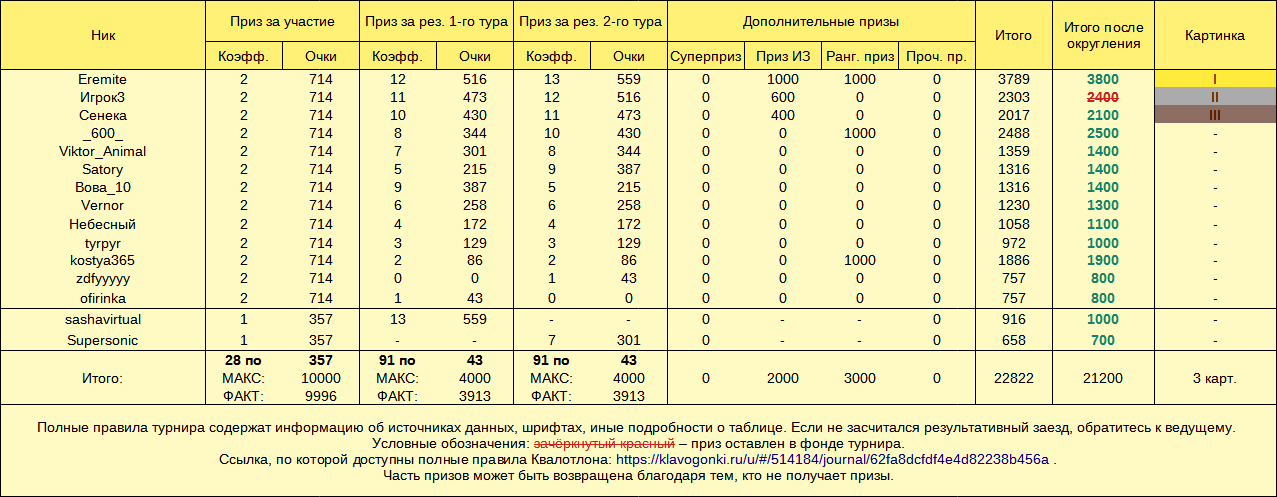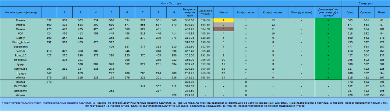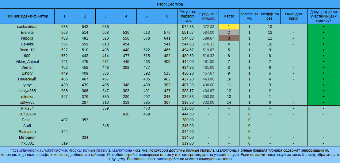 Добро пожаловать в невероятный мир турнира «Квалотлон»! Квалотлон — это турнир, это суббота ( 29 июля), это 20:35, это 15 заездов, это Квалификация и не только она.  Как поучаствовать в турнире? Выполнить 5 обязательных требований к участнику Квалотлона: 1) зайти в заезды, которые создаёт Квалотлон (можно добавить в друзья для удобства). Искать заезды нужно в 20-35 29 июля 2023 года; 2) пройти в первом туре 3 «обычных» заезда (из 6 создаваемых ведущим); 3) успешно пройти во втором туре 5 «квалификационных» заездов (из 9 создаваемых ведущим, текст — тоже «обычный», но картинка); 4) иметь рекорд в «обычных» заездах, который не меньше 300 (до турнира); 5) иметь пробег в «обычных» заездах, который не меньше 500 (на момент подсчёта); Турнир проходит автоматически? Сейчас — да. Если турнир проходит автоматически, к участникам выдвигается ещё одно требование. Необходимо успевать допечатать текст достаточно быстро. В первом туре — за 1,5 минуты. Во втором туре — за 110 секунд общего времени ( включает в себя все паузы). Какие ещё требования к участнику Квалотлона есть? Что может делать ведущий турнира? Честная игра (в том числе ранговая) и соблюдение правил общения и сайта, само собой, тоже обязательны — настолько обязательны, что выше прописывать это требование ведущий даже не стал. Трактовка правил и спорных случаев, добавление, удаление и изменение правил и результатов, в том числе постфактум, остаются за ведущим. Ведущий может не выдавать призы и не заниматься организаторскими действиями, не объясняя причин. Ведущий может запрещать пользователям участвовать (получать призы и попадать в таблицы) — вплоть до полного запрета на участие во всех турнирах Квалотлона. Как определяется победитель? В туре — по средней скорости. В турнире — по сумме мест за 1-й и 2-й туры (меньше — лучше). Какие награды за участие есть? За участие хотя бы в одном туре (при обязательном выполнении требований к участнику Квалотлона под номерами 1, 4 и 5) — приз очками (но лучше поучаствовать в обоих, чтобы очков было больше). За попадание в тройку сильнейших по итогам двух туров (все требования в силе) — картинка от Квалотлона в бортовой журнал и дополнительные очки. Дополнительные призы — ранговый приз и суперприз. Призовой фонд турнира без учёта суперприза — ок. 18-27 тысяч очков. Суперприз... Что это? скрытый текст… Суперприз — это приз за один заезд второго тура (то есть за заезд Квалификации), пройденный очень быстро. Действует только во втором туре. В Квалотлоне №101 размер суперприза — 10 000 очков. С каждым турниром (со стандартным номером) требуемая для получения суперприза скорость чуть-чуть снижается (до момента выигрыша, после которого все начинается сначала). Суперприз выдаётся только участникам, которые соответствуют доп. требованиям к рангу и честности результатов. Ознакомьтесь с информацией о суперпризе: 1. Таблица требований к скорости для получения этого приза. 2. Формула, по которой определяется требуемая скорость, а также другие правила. 3. Что такое Суперподтверждение? - оно тоже необходимо для выдачи этого приза (ссылка ведёт на полные правила, не вся информация по ссылке связана с Суперподтверждением). Скорость, которая нужна во втором туре Квалотлона №101 (достаточно одного заезда при соблюдении других требований): Если ваш рекорд (далее в этом разделе речь во всех случаях про Обычный)