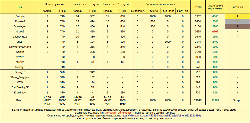 - Общие правила награждения, в том числе правила про уменьшение призов, если участников меньше 5, про округление в меньшую сторону.