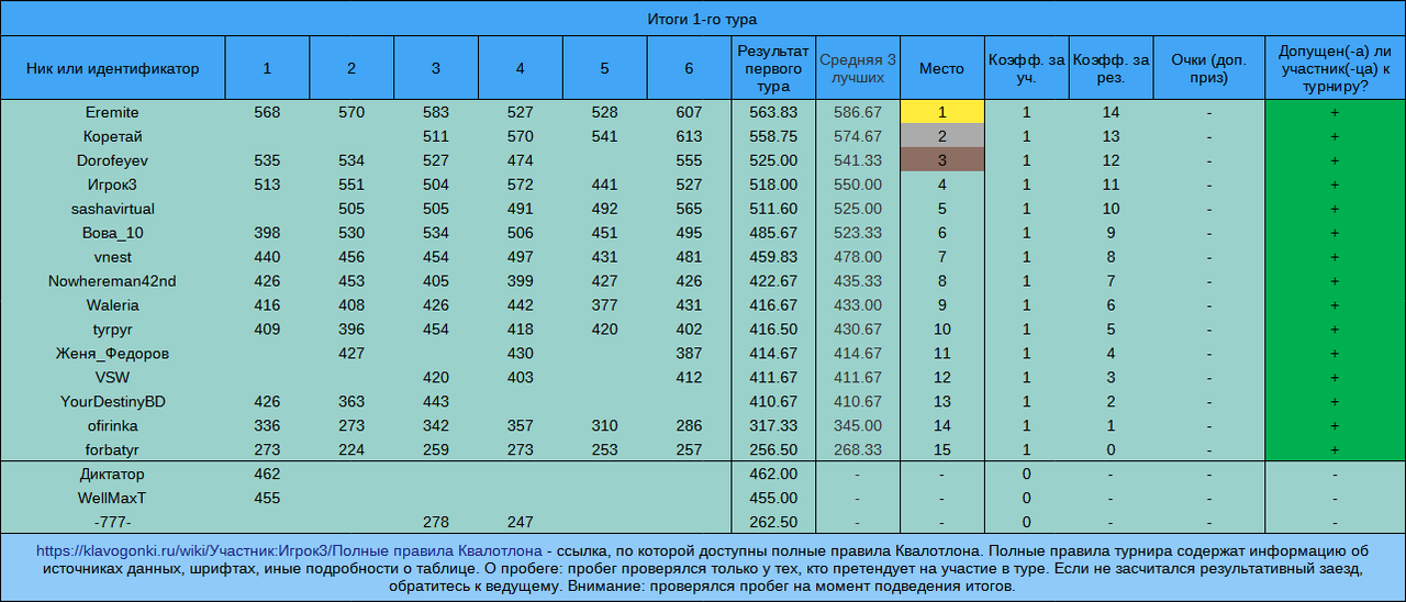 Добро пожаловать в невероятный мир турнира «Квалотлон»! Квалотлон — это турнир, это суббота ( 30 сентября), это 20:35, это 15 заездов, это Квалификация и не только она.  Как поучаствовать в турнире? Выполнить 5 обязательных требований к участнику Квалотлона: 1) зайти в заезды, которые создаёт Квалотлон (можно добавить в друзья для удобства). Искать заезды нужно в 20-35 30 сентября 2023 года; 2) пройти в первом туре 3 «обычных» заезда (из 6 создаваемых ведущим); 3) успешно пройти во втором туре 5 «квалификационных» заездов (из 9 создаваемых ведущим, текст — тоже «обычный», но картинка); 4) иметь рекорд в «обычных» заездах, который не меньше 300 (до турнира); 5) иметь пробег в «обычных» заездах, который не меньше 500 (на момент подсчёта); Турнир проходит автоматически? Сейчас — да. Если турнир проходит автоматически, к участникам выдвигается ещё одно требование. Необходимо успевать допечатать текст достаточно быстро. В первом туре — за 1,5 минуты. Во втором туре — за 110 секунд общего времени ( включает в себя все паузы). Какие ещё требования к участнику Квалотлона есть? Что может делать ведущий турнира? Честная игра (в том числе ранговая) и соблюдение правил общения и сайта, само собой, тоже обязательны — настолько обязательны, что выше прописывать это требование ведущий даже не стал. Трактовка правил и спорных случаев, добавление, удаление и изменение правил и результатов, в том числе постфактум, остаются за ведущим. Ведущий может не выдавать призы и не заниматься организаторскими действиями, не объясняя причин. Ведущий может запрещать пользователям участвовать (получать призы и попадать в таблицы) — вплоть до полного запрета на участие во всех турнирах Квалотлона. Как определяется победитель? В туре — по средней скорости. В турнире — по сумме мест за 1-й и 2-й туры (меньше — лучше). Какие награды за участие есть? За участие хотя бы в одном туре (при обязательном выполнении требований к участнику Квалотлона под номерами 1, 4 и 5) — приз очками (но лучше поучаствовать в обоих, чтобы очков было больше). За попадание в тройку сильнейших по итогам двух туров (все требования в силе) — картинка от Квалотлона в бортовой журнал и дополнительные очки. Дополнительные призы — ранговый приз и суперприз. Призовой фонд турнира без учёта суперприза — ок. 18-27 тысяч очков. Суперприз... Что это? скрытый текст… Суперприз — это приз за один заезд второго тура (то есть за заезд Квалификации), пройденный очень быстро. Действует только во втором туре. В Квалотлоне №105 размер суперприза — 10 000 очков. С каждым турниром (со стандартным номером) требуемая для получения суперприза скорость чуть-чуть снижается (до момента выигрыша, после которого все начинается сначала). Суперприз выдаётся только участникам, которые соответствуют доп. требованиям к рангу и честности результатов. Ознакомьтесь с информацией о суперпризе: 1. Таблица требований к скорости для получения этого приза. 2. Формула, по которой определяется требуемая скорость, а также другие правила. 3. Что такое Суперподтверждение? - оно тоже необходимо для выдачи этого приза (ссылка ведёт на полные правила, не вся информация по ссылке связана с Суперподтверждением). Скорость, которая нужна во втором туре Квалотлона №105 (достаточно одного заезда при соблюдении других требований): Если ваш рекорд (далее в этом разделе речь во всех случаях про