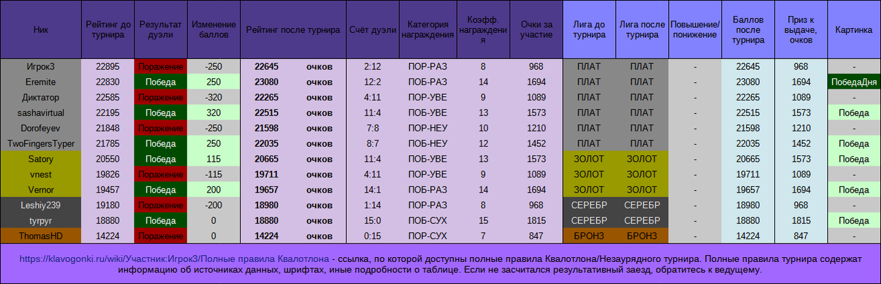 4. Пункт исключён.Лиги 5. Лига - это группа пользователей с определённым (сходным) уровнем развития условного навыка набора текста, определяемого по Обычным заездам. В турнире есть 7 лиг: - Медная (рекорд: 200-299);