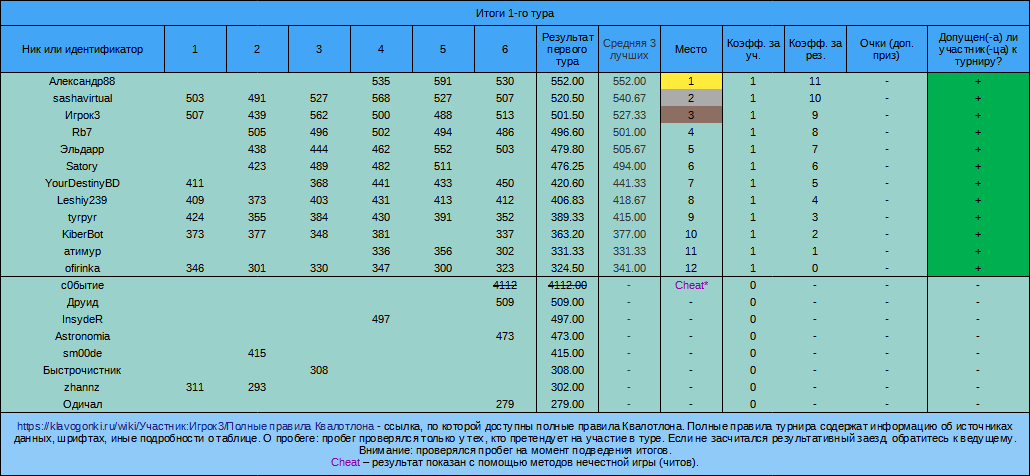Добро пожаловать в невероятный мир турнира «Квалотлон»! Квалотлон — это турнир, это суббота ( 27 января), это 20:35, это 15 заездов, это Квалификация и не только она.  Как поучаствовать в турнире? Выполнить 5 обязательных требований к участнику Квалотлона: 1) зайти в заезды, которые создаёт Квалотлон (можно добавить в друзья для удобства). Искать заезды нужно в 20-35 27 января 2024 года; 2) пройти в первом туре 3 «обычных» заезда (из 6 создаваемых ведущим); 3) успешно пройти во втором туре 5 «квалификационных» заездов (из 9 создаваемых ведущим, текст — тоже «обычный», но картинка); 4) иметь рекорд в «обычных» заездах, который не меньше 300 (до турнира); 5) иметь пробег в «обычных» заездах, который не меньше 500 (на момент подсчёта); Турнир проходит автоматически? Сейчас — да. Если турнир проходит автоматически, к участникам выдвигается ещё одно требование. Необходимо успевать допечатать текст достаточно быстро. В первом туре — за 1,5 минуты. Во втором туре — за 110 секунд общего времени ( включает в себя все паузы). Какие ещё требования к участнику Квалотлона есть? Что может делать ведущий турнира? Честная игра (в том числе ранговая) и соблюдение правил общения и сайта, само собой, тоже обязательны — настолько обязательны, что выше прописывать это требование ведущий даже не стал. Трактовка правил и спорных случаев, добавление, удаление и изменение правил и результатов, в том числе постфактум, остаются за ведущим. Ведущий может не выдавать призы и не заниматься организаторскими действиями, не объясняя причин. Ведущий может запрещать пользователям участвовать (получать призы и попадать в таблицы) — вплоть до полного запрета на участие во всех турнирах Квалотлона. Как определяется победитель? В туре — по средней скорости. В турнире — по сумме мест за 1-й и 2-й туры (меньше — лучше). Какие награды за участие есть? За участие хотя бы в одном туре (при обязательном выполнении требований к участнику Квалотлона под номерами 1, 4 и 5) — приз очками (но лучше поучаствовать в обоих, чтобы очков было больше). За попадание в тройку сильнейших по итогам двух туров (все требования в силе) — картинка от Квалотлона в бортовой журнал и дополнительные очки. Дополнительные призы — ранговый приз и суперприз. Призовой фонд турнира без учёта суперприза — ок. 18-27 тысяч очков. Суперприз... Что это? скрытый текст… Суперприз — это приз за один заезд второго тура (то есть за заезд Квалификации), пройденный очень быстро. Действует только во втором туре. В Квалотлоне №106 размер суперприза — 10 000 очков. С каждым турниром (со стандартным номером) требуемая для получения суперприза скорость чуть-чуть снижается (до момента выигрыша, после которого все начинается сначала). Суперприз выдаётся только участникам, которые соответствуют доп. требованиям к рангу и честности результатов. Ознакомьтесь с информацией о суперпризе: 1. Таблица требований к скорости для получения этого приза. 2. Формула, по которой определяется требуемая скорость, а также другие правила. 3. Что такое Суперподтверждение? - оно тоже необходимо для выдачи этого приза (ссылка ведёт на полные правила, не вся информация по ссылке связана с Суперподтверждением). Скорость, которая нужна во втором туре Квалотлона №106 (достаточно одного заезда при соблюдении других требований): Если ваш рекорд (далее в этом разделе речь во всех случаях про Обы