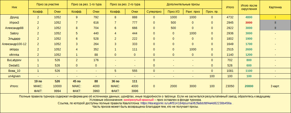 Добро пожаловать в невероятный мир турнира «Квалотлон»! Квалотлон — это турнир, это суббота ( 13 апреля), это 20:35, это 15 заездов, это Квалификация и не только она.  Как поучаствовать в турнире? Выполнить 5 обязательных требований к участнику Квалотлона: 1) зайти в заезды, которые создаёт Квалотлон (можно добавить в друзья для удобства). Искать заезды нужно в 20-35 13 апреля 2024 года; 2) пройти в первом туре 3 «обычных» заезда (из 6 создаваемых ведущим); 3) успешно пройти во втором туре 5 «квалификационных» заездов (из 9 создаваемых ведущим, текст — тоже «обычный», но картинка); 4) иметь рекорд в «обычных» заездах, который не меньше 300 (до турнира); 5) иметь пробег в «обычных» заездах, который не меньше 500 (на момент подсчёта); Турнир проходит автоматически? Сейчас — да. Если турнир проходит автоматически, к участникам выдвигается ещё одно требование. Необходимо успевать допечатать текст достаточно быстро. В первом туре — за 1,5 минуты. Во втором туре — за 110 секунд общего времени ( включает в себя все паузы). Какие ещё требования к участнику Квалотлона есть? Что может делать ведущий турнира? Честная игра (в том числе ранговая) и соблюдение правил общения и сайта, само собой, тоже обязательны — настолько обязательны, что выше прописывать это требование ведущий даже не стал. Трактовка правил и спорных случаев, добавление, удаление и изменение правил и результатов, в том числе постфактум, остаются за ведущим. Ведущий может не выдавать призы и не заниматься организаторскими действиями, не объясняя причин. Ведущий может запрещать пользователям участвовать (получать призы и попадать в таблицы) — вплоть до полного запрета на участие во всех турнирах Квалотлона. Как определяется победитель? В туре — по средней скорости. В турнире — по сумме мест за 1-й и 2-й туры (меньше — лучше). Какие награды за участие есть? За участие хотя бы в одном туре (при обязательном выполнении требований к участнику Квалотлона под номерами 1, 4 и 5) — приз очками (но лучше поучаствовать в обоих, чтобы очков было больше). За попадание в тройку сильнейших по итогам двух туров (все требования в силе) — картинка от Квалотлона в бортовой журнал и дополнительные очки. Дополнительные призы — ранговый приз и суперприз. Призовой фонд турнира без учёта суперприза — ок. 18-27 тысяч очков. Суперприз... Что это? скрытый текст… Суперприз — это приз за один заезд второго тура (то есть за заезд Квалификации), пройденный очень быстро. Действует только во втором туре. В Квалотлоне №110 размер суперприза — 150 очков. С каждым турниром (со стандартным номером) требуемая для получения суперприза скорость чуть-чуть снижается (до момента выигрыша, после которого все начинается сначала). Суперприз выдаётся только участникам, которые соответствуют доп. требованиям к рангу и честности результатов. Ознакомьтесь с информацией о суперпризе: 1. Таблица требований к скорости для получения этого приза. 2. Формула, по которой определяется требуемая скорость, а также другие правила. 3. Что такое Суперподтверждение? - оно тоже необходимо для выдачи этого приза (ссылка ведёт на полные правила, не вся информация по ссылке связана с Суперподтверждением). Скорость, которая нужна во втором туре Квалотлона №111 (достаточно одного заезда при соблюдении других требований): Если ваш рекорд (далее в этом разделе речь во всех случаях про Обычн
