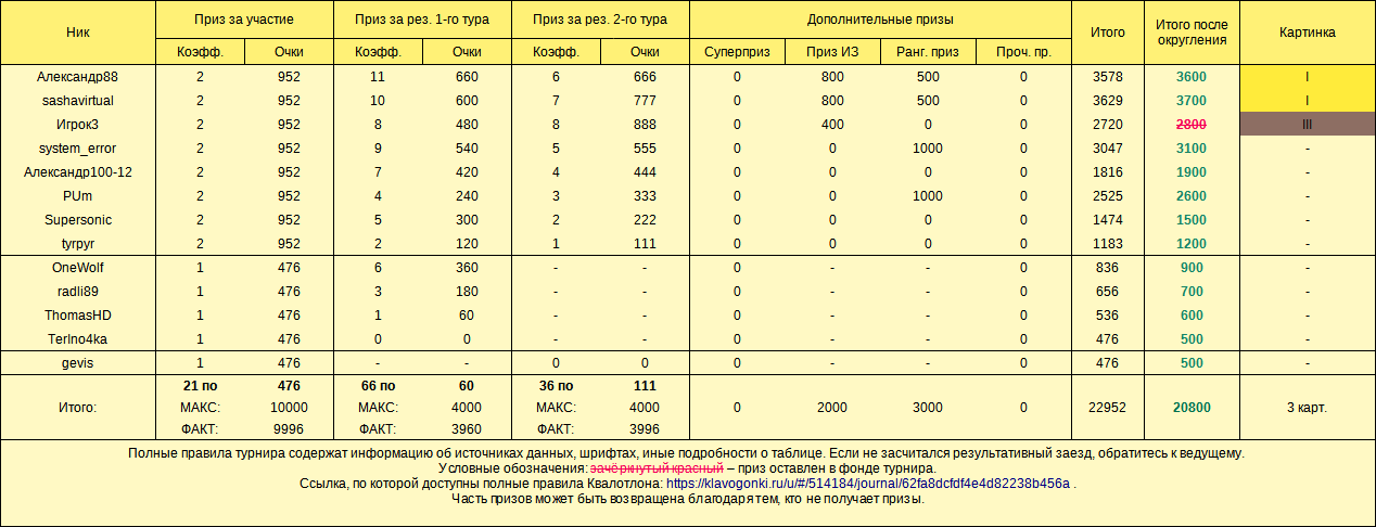 Добро пожаловать в невероятный мир турнира «Квалотлон»! Квалотлон — это турнир, это суббота ( 20 апреля), это 20:35, это 15 заездов, это Квалификация и не только она.  Как поучаствовать в турнире? Выполнить 5 обязательных требований к участнику Квалотлона: 1) зайти в заезды, которые создаёт Квалотлон (можно добавить в друзья для удобства). Искать заезды нужно в 20-35 20 апреля 2024 года; 2) пройти в первом туре 3 «обычных» заезда (из 6 создаваемых ведущим); 3) успешно пройти во втором туре 5 «квалификационных» заездов (из 9 создаваемых ведущим, текст — тоже «обычный», но картинка); 4) иметь рекорд в «обычных» заездах, который не меньше 300 (до турнира); 5) иметь пробег в «обычных» заездах, который не меньше 500 (на момент подсчёта); Турнир проходит автоматически? Сейчас — да. Если турнир проходит автоматически, к участникам выдвигается ещё одно требование. Необходимо успевать допечатать текст достаточно быстро. В первом туре — за 1,5 минуты. Во втором туре — за 110 секунд общего времени ( включает в себя все паузы). Какие ещё требования к участнику Квалотлона есть? Что может делать ведущий турнира? Честная игра (в том числе ранговая) и соблюдение правил общения и сайта, само собой, тоже обязательны — настолько обязательны, что выше прописывать это требование ведущий даже не стал. Трактовка правил и спорных случаев, добавление, удаление и изменение правил и результатов, в том числе постфактум, остаются за ведущим. Ведущий может не выдавать призы и не заниматься организаторскими действиями, не объясняя причин. Ведущий может запрещать пользователям участвовать (получать призы и попадать в таблицы) — вплоть до полного запрета на участие во всех турнирах Квалотлона. Как определяется победитель? В туре — по средней скорости. В турнире — по сумме мест за 1-й и 2-й туры (меньше — лучше). Какие награды за участие есть? За участие хотя бы в одном туре (при обязательном выполнении требований к участнику Квалотлона под номерами 1, 4 и 5) — приз очками (но лучше поучаствовать в обоих, чтобы очков было больше). За попадание в тройку сильнейших по итогам двух туров (все требования в силе) — картинка от Квалотлона в бортовой журнал и дополнительные очки. Дополнительные призы — ранговый приз и суперприз. Призовой фонд турнира без учёта суперприза — ок. 18-27 тысяч очков. Суперприз... Что это? скрытый текст… Суперприз — это приз за один заезд второго тура (то есть за заезд Квалификации), пройденный очень быстро. Действует только во втором туре. В Квалотлоне №112 размер суперприза — 150 очков. С каждым турниром (со стандартным номером) требуемая для получения суперприза скорость чуть-чуть снижается (до момента выигрыша, после которого все начинается сначала). Суперприз выдаётся только участникам, которые соответствуют доп. требованиям к рангу и честности результатов. Ознакомьтесь с информацией о суперпризе: 1. Таблица требований к скорости для получения этого приза. 2. Формула, по которой определяется требуемая скорость, а также другие правила. 3. Что такое Суперподтверждение? - оно тоже необходимо для выдачи этого приза (ссылка ведёт на полные правила, не вся информация по ссылке связана с Суперподтверждением). Скорость, которая нужна во втором туре Квалотлона №112 (достаточно одного заезда при соблюдении других требований): Если ваш рекорд (далее в этом разделе речь во всех случаях про Обычн