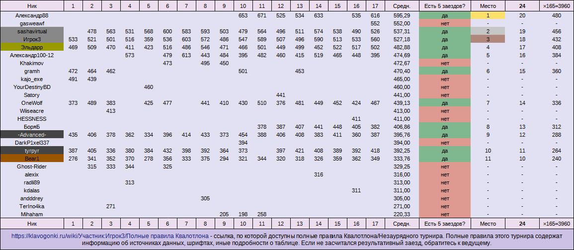 2. 1. Примечание.скрытый текст… По просьбе участника при определении пробега могут учитываться клоны. По просьбе участника количество турниров подряд, которые можно пропустить, может быть увеличено (но ведущий может за один раз разрешить пропустить только те 7 турниров, которые по плану следуют за временем просьбы участника). 2. 2. Примечание Спорные способы участия в турнире.скрытый текст… 2. 2. 1. Разрешается использование АЗ, если такое использование администрация не считает читерством (например, читерством является подгон слов под конкретный текст/словарь). Рекомендуется указывать факт использования АЗ, но это необязательно. 2. 2. 2. Разрешается недопечатывать тексты до конца, чтобы поднять свою среднюю скорость (выбор лучших заездов пока не применяется). Тем не менее, если правила турнира предусматривают, что участники обязаны проехать некоторые заезды для участия/зачёта/получения приза и т. п., этот пункт не даёт возможности рассчитывать на какую-либо компенсацию соответствующих результатов или призов. 3. Существуют два способа подачи заявки: 3. 1. Заранее (не позднее чем за 5 минут до начала турнира) подать заявку-сообщение на форуме (в главной теме турнира). 3. 2. Подать заявку в чате с помощью команды /join (нужно написать сообщение с фразой " /join"). 3. 2. 1. Для второго способа подачи заявки действуют ограничения: скрытый текст… 3. 2. 1. 1. В Незаурядной лиге активировать команду /join можно только в ходе первых двух заездов, потому что все остальные заезды уже относятся к дуэлям. <Скрыта часть правил, не относящаяся к модификации турнира «Лига».> 3. 2. 1. 3. Могут быть и другие ограничения, которые или описываются в правилах, или устанавливаются ведущим. 3. 3. После подачи заявки происходит одно из следующих событий: - ведущий отклоняет заявку из-за несоответствия участника требованиям правил;