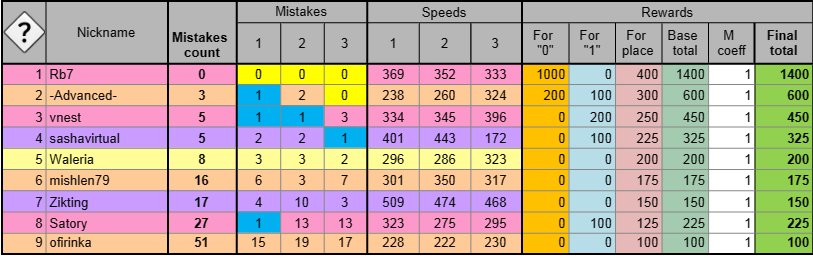 Бонусный объединённый зачёт для 7 рангов. Победители определяются по суммарному количеству ошибок. Если несколько участников имеют одинаковое число ошибок, то действует следующее правило: