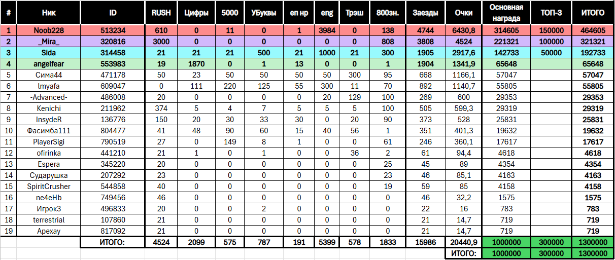Итоговая таблица по совместному событию:  Очки раздал, GIF отправил вместе с ними. Кто хочет себе в био - напишите в лс. Участнику Espera не смог отправить очки, заявку в друзья отправил.