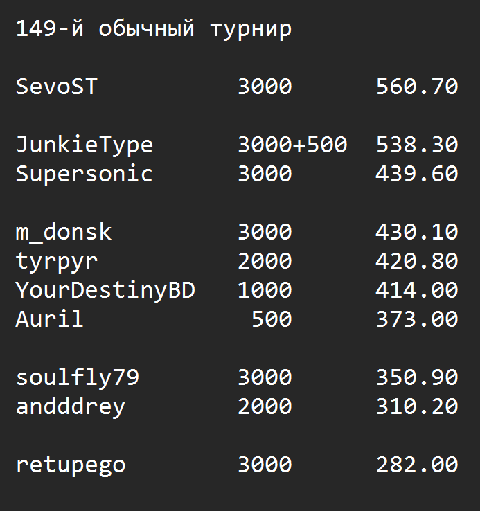 Поэтому я не успела до начала апреля (с которого у нас предположительно будут действовать новые клубные правила) описать эти самые новые правила. Правила клуба придуманы. Более того, придуман рейтинг мБГ, Марафонотоп и рейтинг (по типу Книготопа). Надеюсь, у меня получится представить все это на форуме до конца апреля. Если не получится, до момента представления полных новых клубных правил алгоритм подведения итогов будет с такими изменениями: 1) Шкала призовых несколько изменяется. скрытый текст… 2) Размер призовых. Игроки, попадающие в топ 10 мБГ месяца с суммарным спонсорским вкладом менее 100к очков будут получать половину приза, вторая половина будет идти на формирование призового фонда мБГ. Сумму своих спонсорских вкладов вы можете посмотреть, открыв полностью диалог с LittleBigRace, включив поиск на странице (Ctrl + F), введя запрос «Вы перевели пользователю» и просуммировав указанные суммы. 3) Веса рангов обновлены (они уже предыдущие 2 месяца таковы, просто поскольку призы за места были символическими, я их не описывала). 1) Ранг по средней скорости (вес 0,23). 2) Ранг по точности (выраженной средним процентом ошибок) (вес 0,23). 3) Ранг по доле участия в мБГ (в зачет идут марафоны, которые участник набрал со скоростью не менее 50% от рекорда) (вес 0,23). 4) Ранг по пробегу в Марафонах (по данным после последнего тура мБГ месяца) (вес 0,10). 5) Ранг по пробегу в марафонах в течение месяца вне мБГ (по данным после последнего тура мБГ месяца) (вес 0,15). 6) Ранг по пробегу в Обычном режиме (по данным после последнего тура мБГ месяца) (вес 0,06). Под хайдом прежние веса: скрытый текст… Всем новых марафонов в новом месяце! Добро пожаловать в клуб мБГ! Последний раз отредактировано 1 апреля 2026 в 04:43 пользователем Сударушка