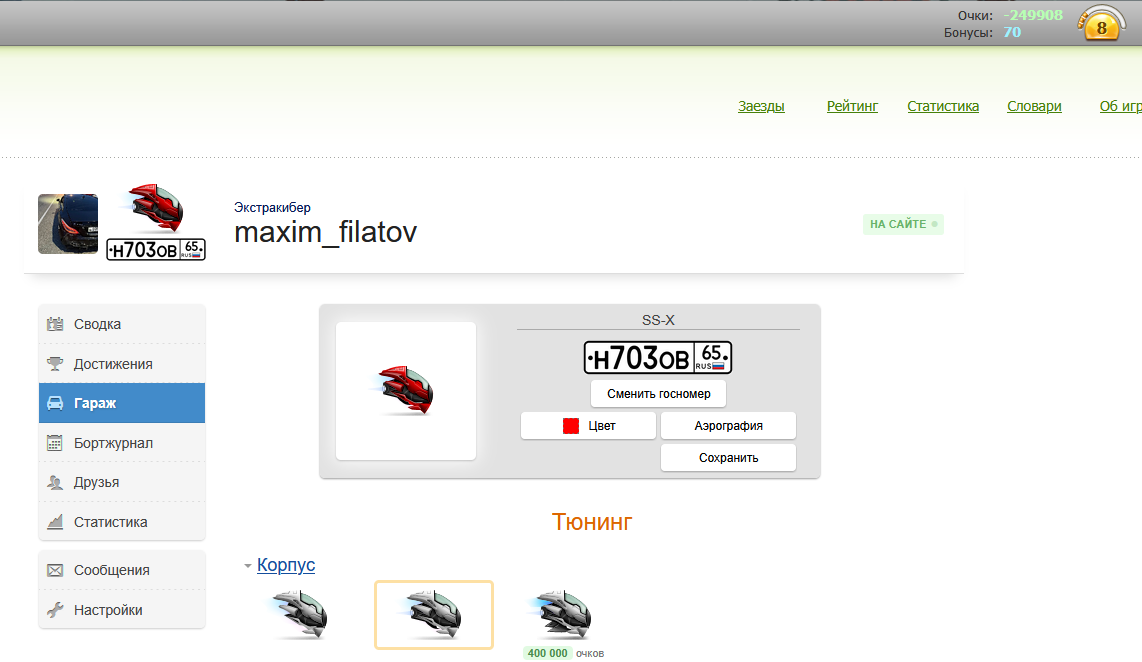 Добрый день, Даниэль. Достаточно хорошее обновление с номерами, понравилось, просто супер, как либо запросами подобрать крутой номер вроде нельзя, но я нашел другой баг.... Я поставил себе тюнинг на машинку и себя на счетчик. Мне кажется, если начать все вскрывать, то можно будет поставить любой тюнинг на машинку.
