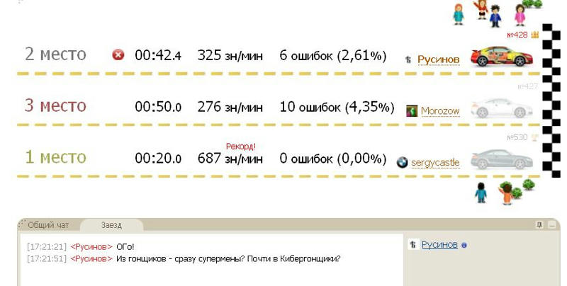 Сегодня увидел поразительный результат, сначала в него поверил, потом начал сомневаться. Если это не глюк, у меня возникают сомнения в честности данного результата. http://klavogonki.ru/profile/49466/stats/ (на момент этого заезда рекорд был 429 – сейчас больше)  Да прошло много времени после активного участия, но рекорд 687, после того как четыре дня до этого в марафоне результат был http://klavogonki.ru/profile/49466/blog/post85/#comments Марафон – 350 зн/мин А лучший результат в обычном за неделю 414… Не верю – похоже на использование сторонних программ. Я могу поверить в 500, 550, и даже в районе 600, но под 700 при таких результатах это крайне подозрительно. И верить ли после этого в рекорд в обычном 451 http://klavogonki.ru/profile/49466/blog/post86/#more это ещё вопрос. Выложите клавограмму или видео, подтверждающее что такой результат это не показатели программы набора. Обновление: Sergycastle объяснил, что это был глюк. Ещё раз приношу свои извинения, я не хотел как-то навредить репутации. Глюк бывают с каждым. Последний раз отредактировано 5 июня 2010 в 21:30 пользователем Русинов