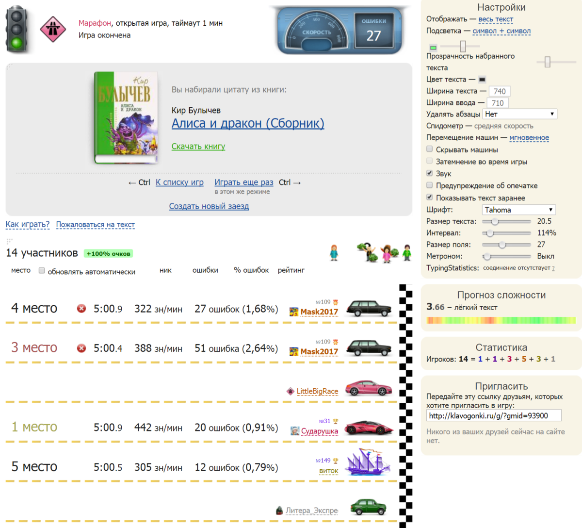 Mask2017, да ты чо) Я каждый день такое наблюдаю 2-3 раза, а то и больше - баг старинный, как сами клавогонки) Это просто визуальное задвоение (если до старта выйти из заезда и зайти снова - то все будет окей). Единственный момент, когда этот баг может доставить неудобство - если тот игрок (который выступает в роли твоей копии) - получает уровень (то у вас будет капать по +10 бонусов до выхода из заезда - правда эти бонусы потом исчезнут, тоже чисто визуальный баг); а вот если игрок копия - проедет в новом для себя словаре на скорости выше 500 и ему потребуется проходить квалификацию - то эта же табличка выскочит и у вас, и закрыть ее не будет никакой возможности.